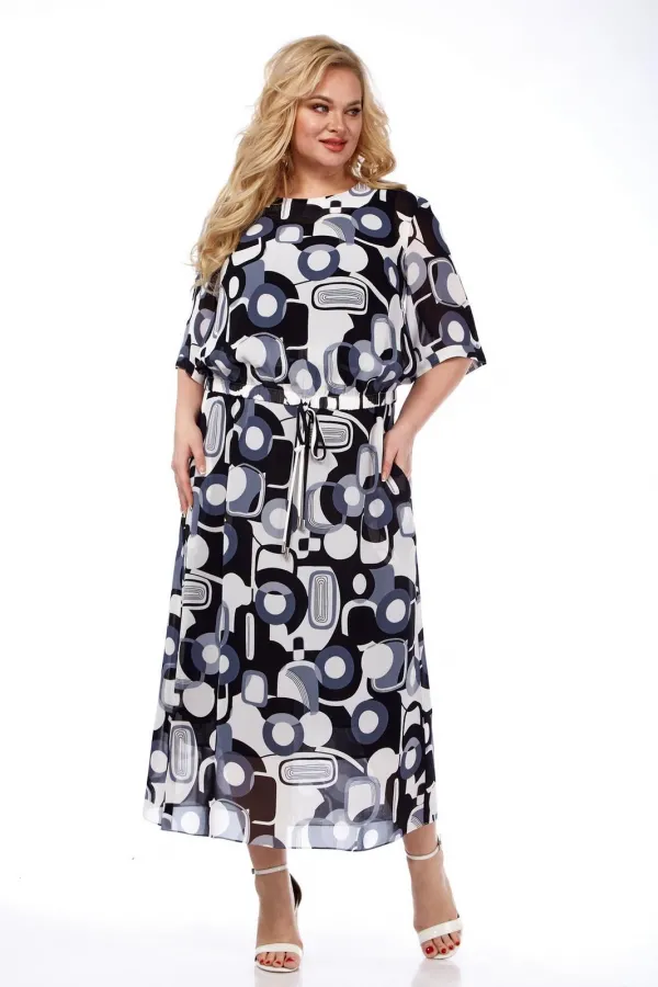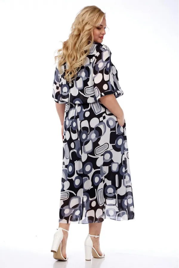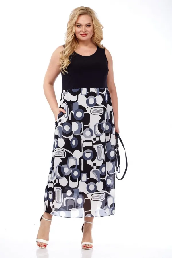 Комплект: платье и блуза. Платье А-силуэта, комбинированное из трикотажного полотна и шифона, отрезное по талии. Блуза изготовлена из шифона, свободная, по низу кулиса. Горловина круглая. Рукав спущенный, короткий. Длина платья по спинке – 124 см. Длина блузы по спинке – 53 см, рукава — 31 см.