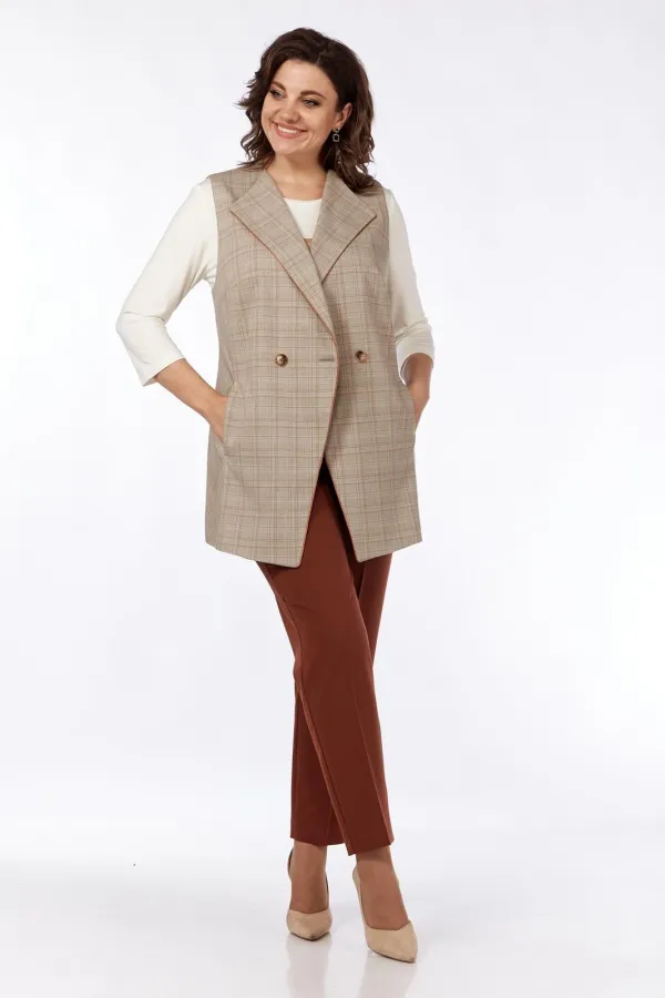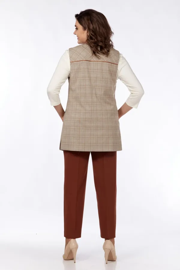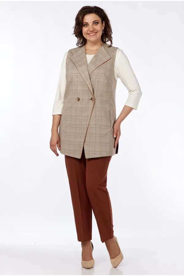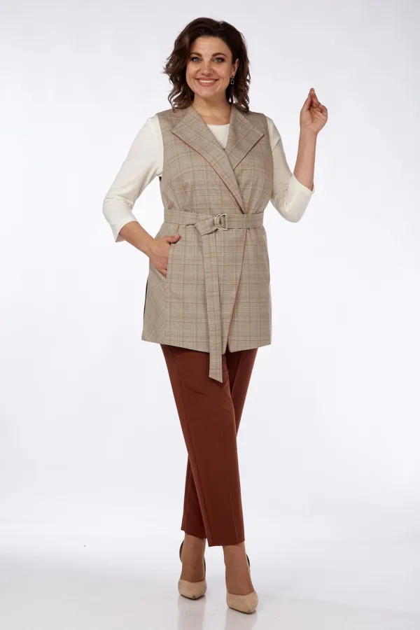 Комплект брючный 3-х предметный. Состоит из жилетки, брюк и блузы. Жилет изготовлен из костюмной ткани. Застежка двубортная на петли и пуговицы с отложными лацканами. Перед жилета с нагрудными вытачками и с боковыми дета... Читать далее...
