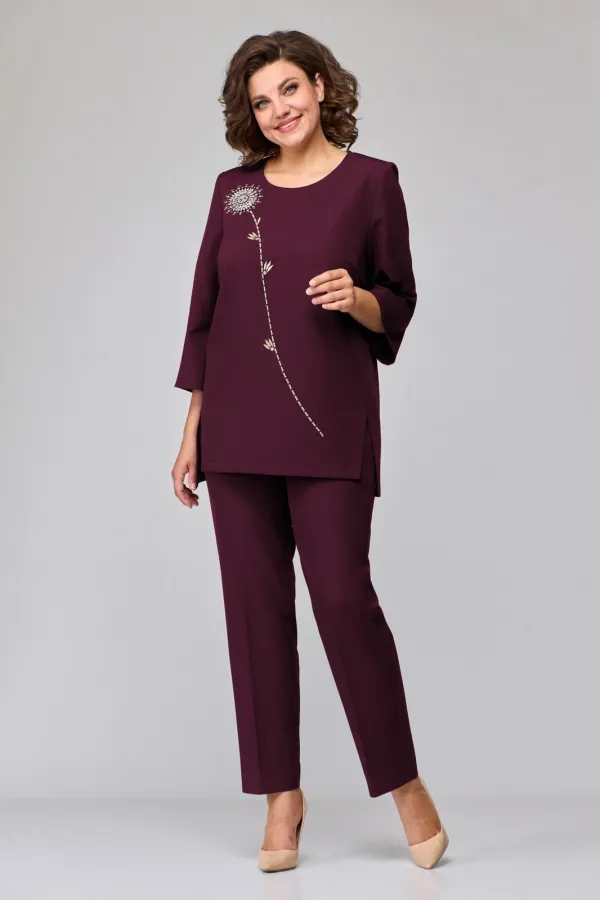 Комплект брючный 2-х предметный, состоит из блузы и брюк, изготовлен из костюмно-плательной ткани. Блуза прямого силуэта с нагрудными вытачками. Боковые швы перенесены на перед, в них обработаны фигурные разрезы. Спинка со средним швом с застежкой на навесную петлю и пуговицу. Горловина округлой формы. Рукав втачной одношовный, длиной ⅞. Блуза декорирована вышивкой. Брюки средней посадки, пояс частично на резинке. В передних деталях брюк обработаны карманы с подрезным бочком. Брюки со стрелками.
