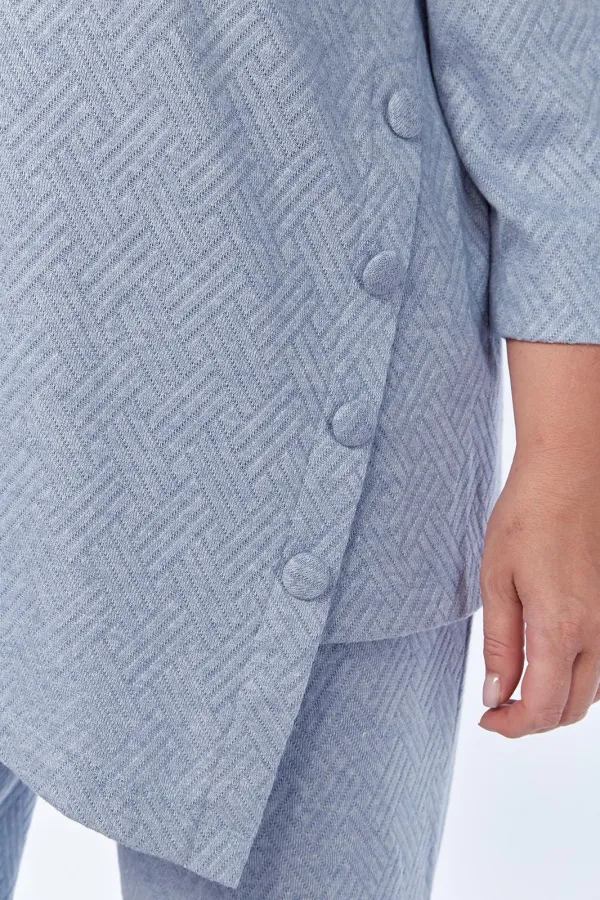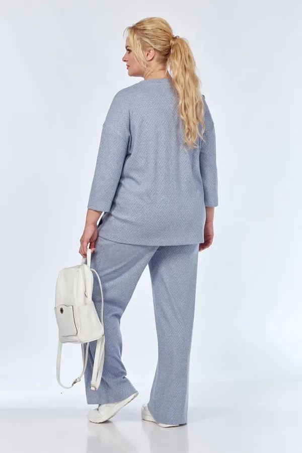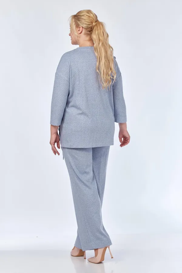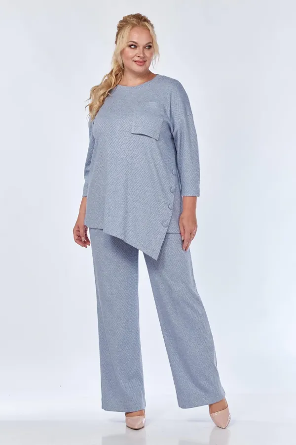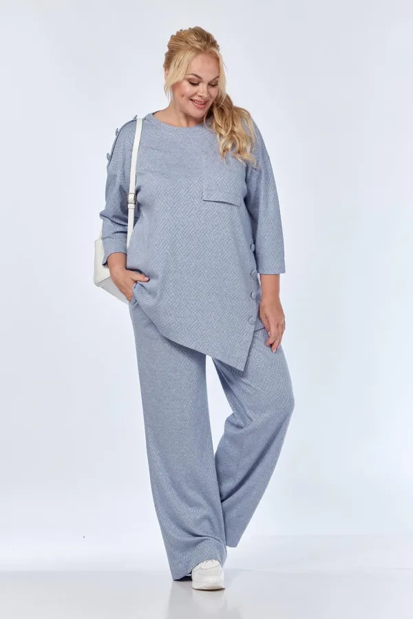 Костюм женский брючный 2 — ух предметный, изготовлен из трикотажного полотна. Джемпер свободного силуэта, горловина круглой формы. Перед с нагрудным накладным карманом. Низ изделия ассиметричный. На складке бокового и пл... Читать далее...