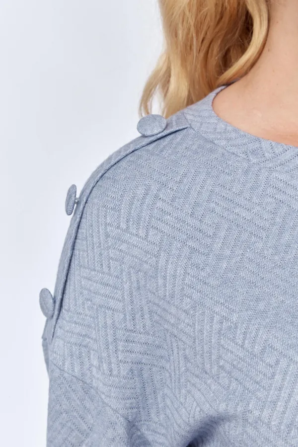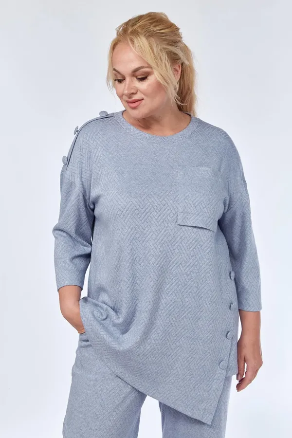 Костюм женский брючный 2 — ух предметный, изготовлен из трикотажного полотна. Джемпер свободного силуэта, горловина круглой формы. Перед с нагрудным накладным карманом. Низ изделия ассиметричный. На складке бокового и плечевого шва декоративные обтяжные пуговицы. Рукава спущенные, длиной ⅞. Брюки средней посадки, пояс на резинке, обработаны боковые карманы. Брюки прямого покроя.