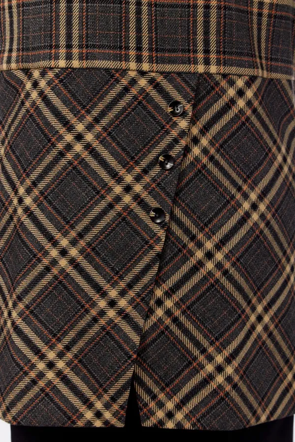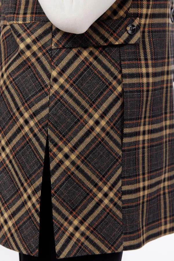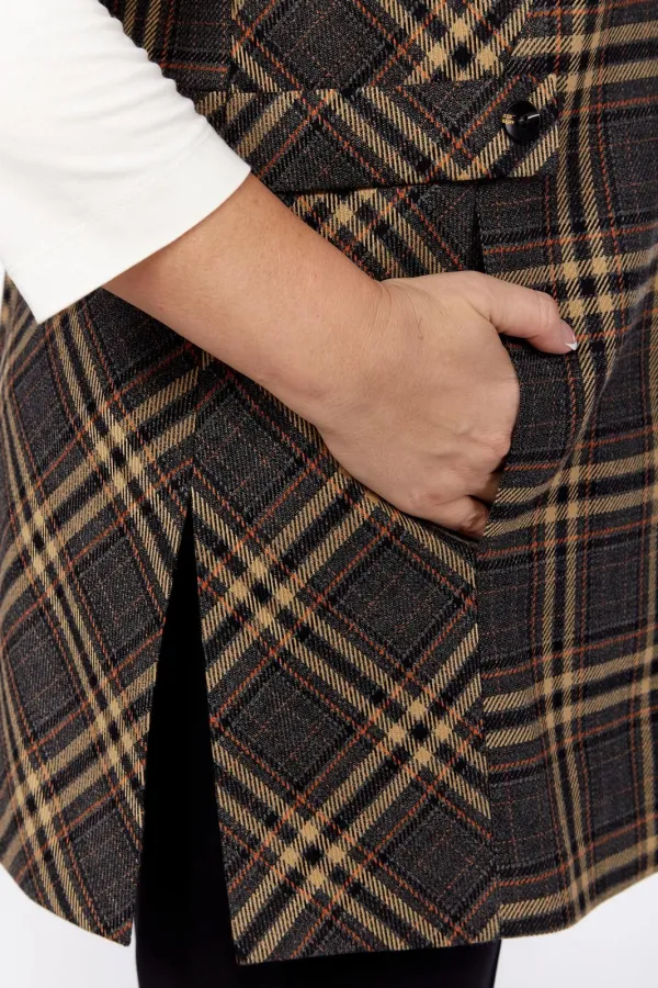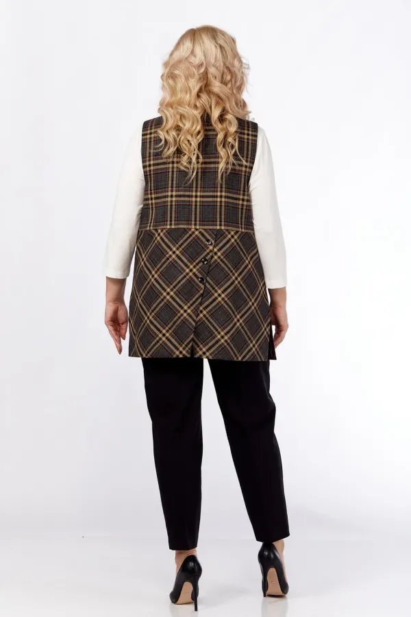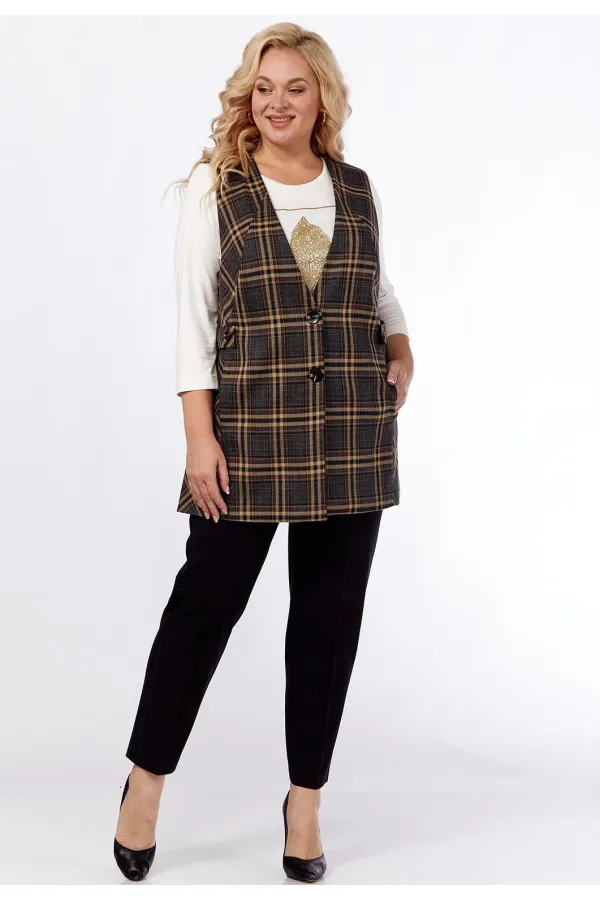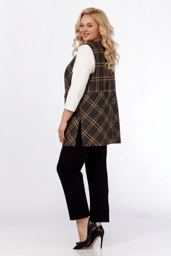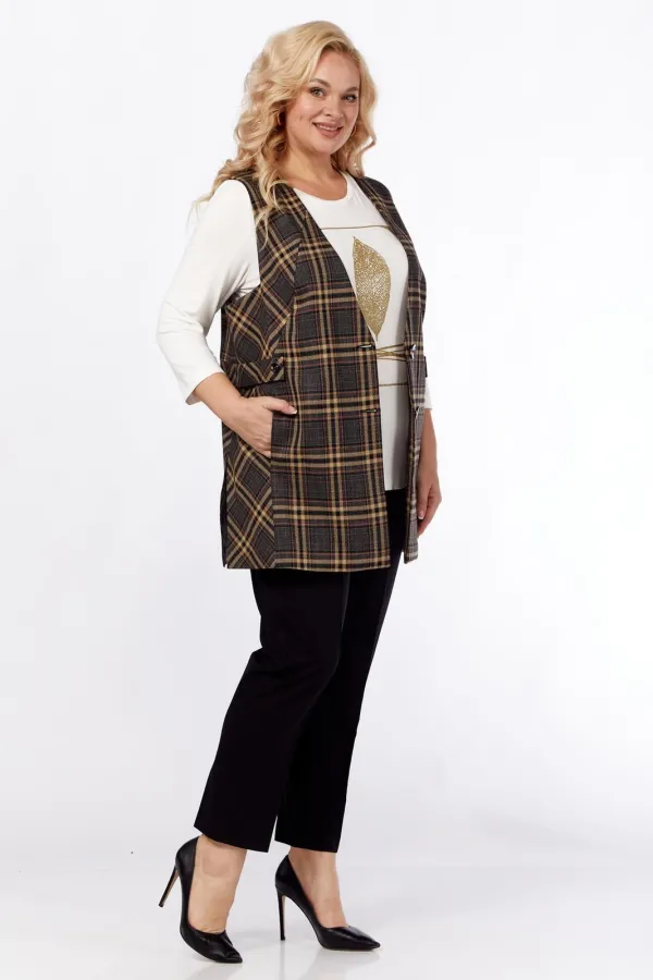 Костюм брючный 3х — предметный, состоит из жилетки, брюк и джемпера. Жилет выполнен из костюмной ткани в клеточку, прямого силуэта. Горловина V-образной формы. Застежка центральная на две петли и пуговицы. По переду фигу... Читать далее...
