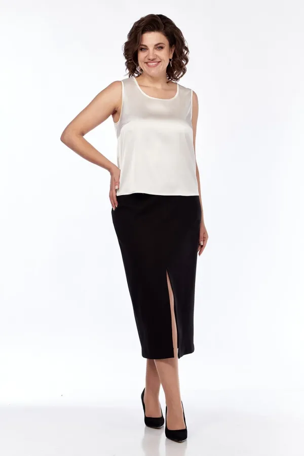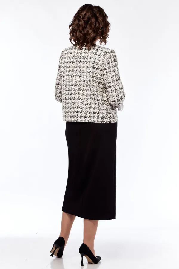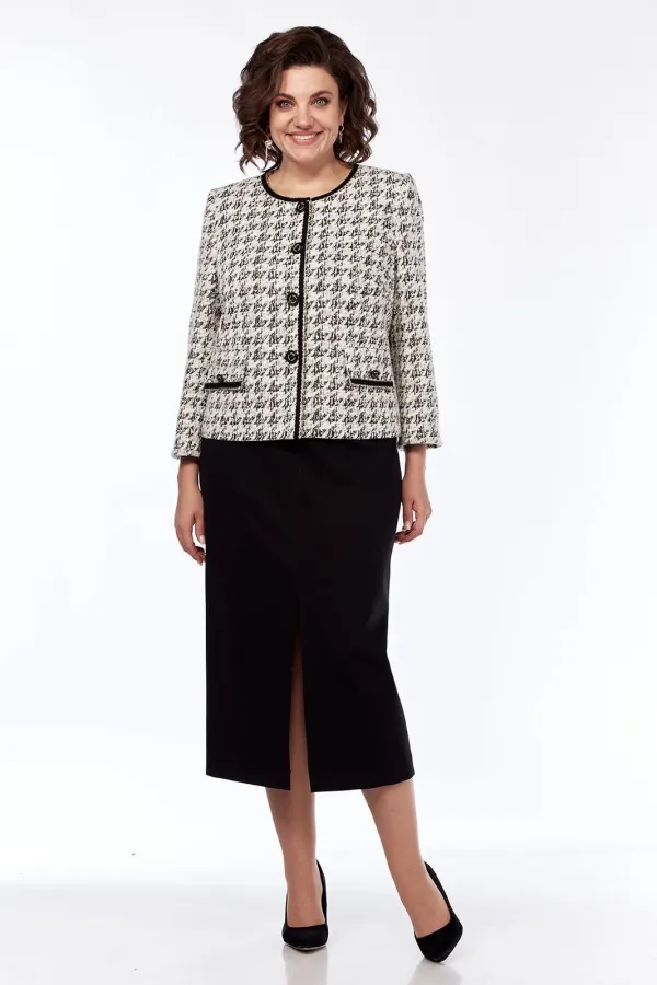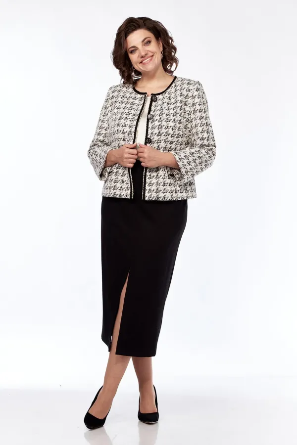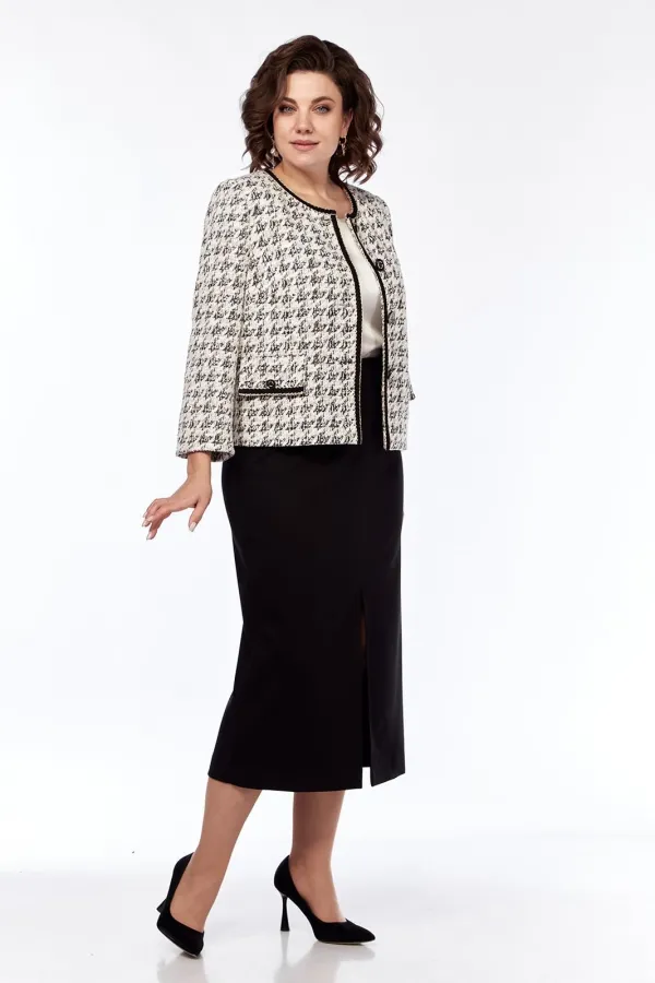 Комплект женский трехпредметный, состоит из жакета, юбки и топа. Жакет прямого силуэта выполнен из трикотажного полотна. Горловина округлой формы, застежка центрально-бортовая на петли и пуговицы. По переду нагрудные вытачки и прорезные карманы с клапанами. Спинка цельнокроенная. Рукава втачные двухшовные. Жакет декорирован отделочной тесьмой. Изделие на подкладке. Юбка зауженная к низу, выполнена из трикотажного полотна премиум — класса. Верх юбки обработан обтачкой. Застежка на потайную молнию. По переду разрез. Топ выполнен из блузочной ткани. Перед с нагрудными вытачками. Спинка цельнокроенная. Горловина и проймы обработаны окантовкой.