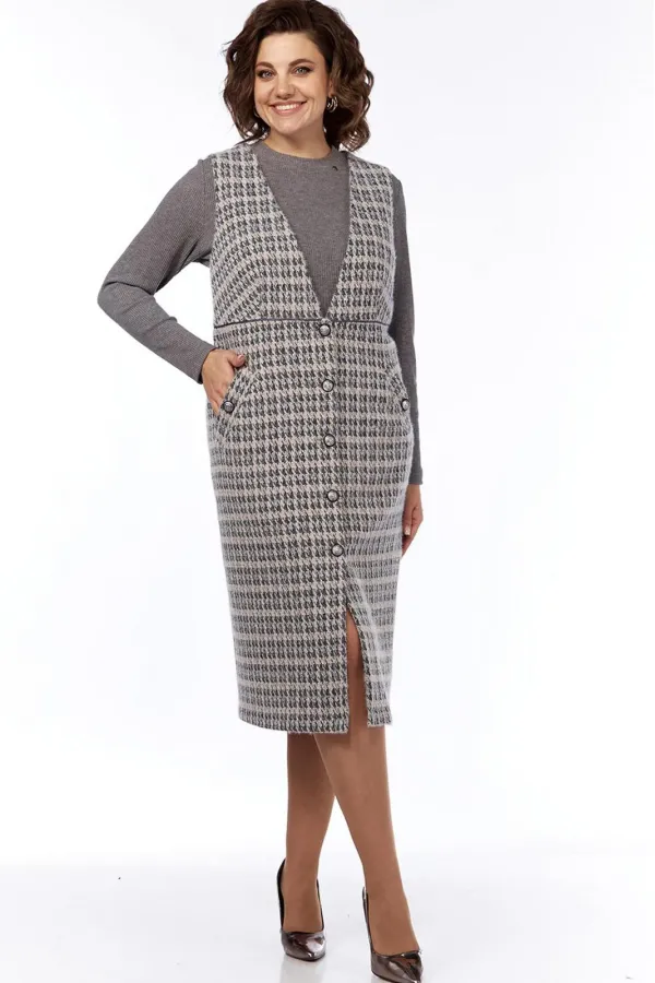 Комплект женский двухпредметный, состоит из джемпера и сарафана. Сарафан прямого силуэта выполнен из трикотажного полотна. Горловина V — образной формы застежка центральная на петли с пуговицами. Перед разрезной по линии талии шов дополнен кантом. Карманы прорезные с одной листочкой. Спинка со средним швом. Сарафан на подкладке. Джемпер полуприлегающего силуэта, выполнен из трикотажного полотна ( лапша ) горловина обработана планкой. Перед и спинка цельнокроеные. Рукава втачные.