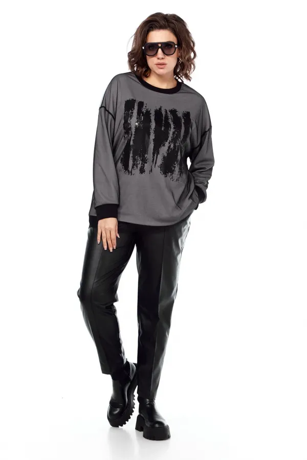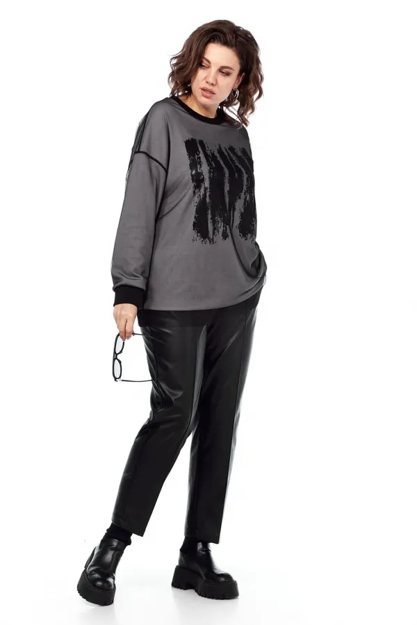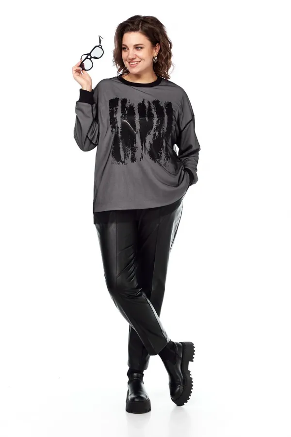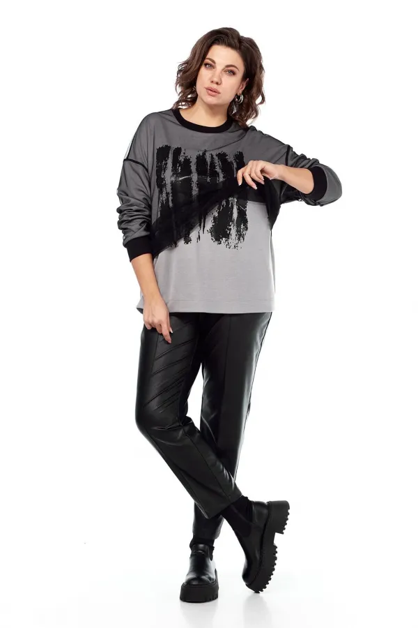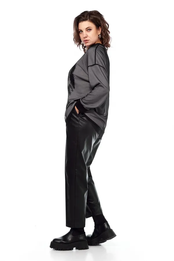 Комплект брючный двухпредметный. Состоит из джемпера и брюк. Джемпер выполнен из трикотажного полотна, и сетки, путем наложения одной ткани на другую. Изделие свободного силуэта. Перед и спинка цельнокроеные. Рукава спущенные. Низ рукавов и горловина обработаны довязом. Брюки женские, классической посадки, немного заужены к низу, выполнены из экокожи. По передним деталям брюк обработаны карманы с подрезным бочком и застрочены стрелки. Пояс притачной на эластичной тесьме.