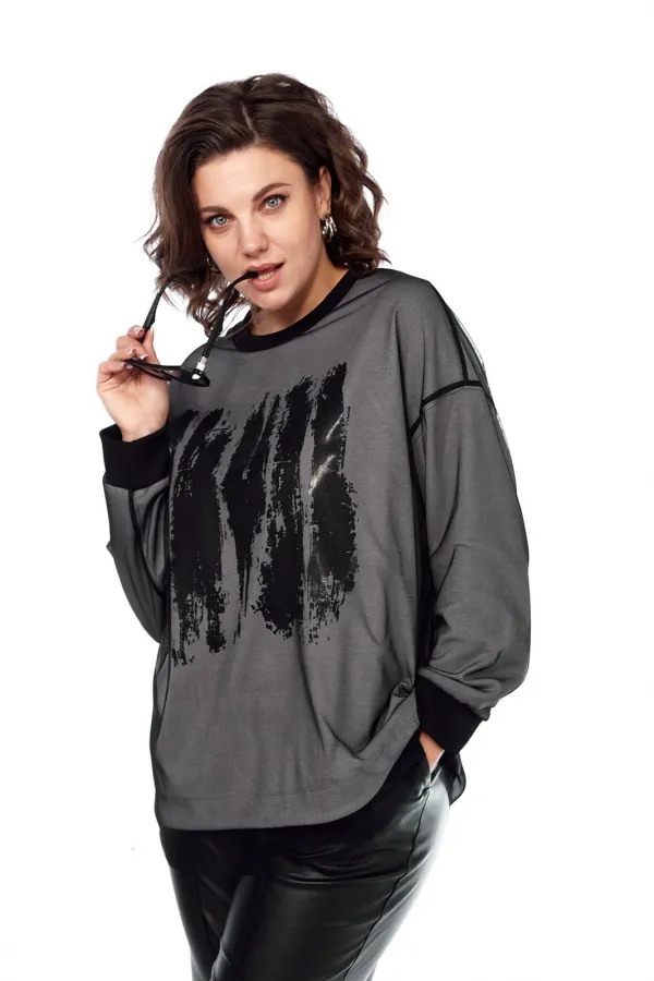 Комплект брючный двухпредметный. Состоит из джемпера и брюк. Джемпер выполнен из трикотажного полотна, и сетки, путем наложения одной ткани на другую. Изделие свободного силуэта. Перед и спинка цельнокроеные. Рукава спущ... Читать далее...