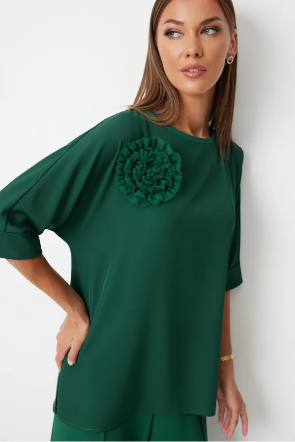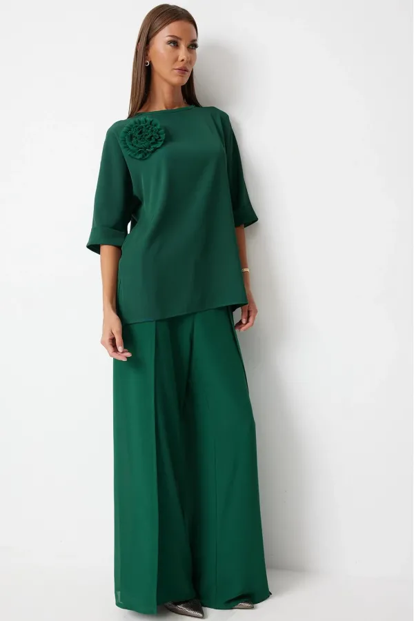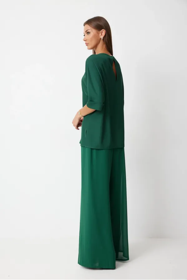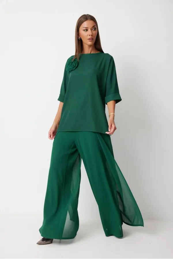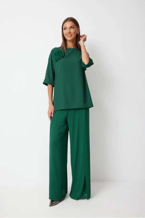 Костюм состоит из блузы и брюк. Блуза женская прямого силуэта закрывающая линию паха с цельнокроеными рукавами. К блузке прилагается съёмный декор – цветок. По боковым швам располагаются разрезы. Спинка с центральным швом и застежкой на навесную петлю и пуговицу. Горловина обработана косой бейкой. Рукав до локтя, низ рукава обработан отрезной отворачивающейся манжетой, закрепленной по швам. Низ блузки обработан швом «в подгибку». Брюки прямого силуэта, выполнены из шифоновой ткани на подкладке полной длинны. Боковой шов брюк открыт. Синка брюк заходит на перед по верхней части. Подкладка из не просвещающейся креповой ткани. Верх брюк обработан отрезным поясом. Центральная часть пояса без резинки, остальной пояс на резинке. Низ брюк обработан швом « в подгибку». Цвет материала может отличаться по тону в зависимости от настроек вашего монитора!.
