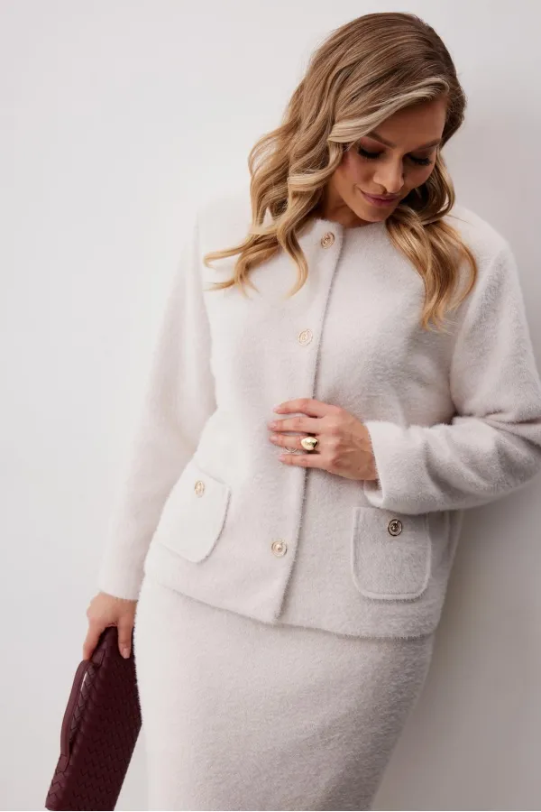 Костюм женский состоящий из жакета и юбки. Жакет женский из трикотажной ткани прямого силуэта на подкладке. На деталях переда настрочены накладные карманы округлой формы застегивающиеся на декоративные кнопки. Спинка прямая. Рукав двухшовный с имитацией шлицы. Горловина округлой формы. Жакет застегивается на декоративные кнопки.