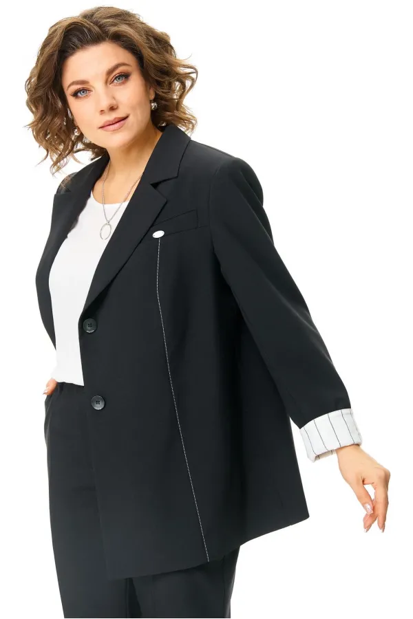 Жакет прямой, полностью на подкладке. По переду выполнен 1 накладной карман с защипом с контрастной отстрочкой. Отделка в виде вертикального шва с контрастной отстрочкой и декоративной листочкой в верхней части переда. Воротник пиджачный. Нагрудная выточка спрятана под воротник. Застёжка центральная на 2 петли и пуговицы. Рукав втачной двушовный. Низ рукава выполнен с контрастной отделкой, может отворачиваться как манжет.