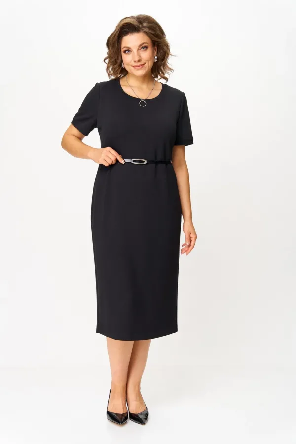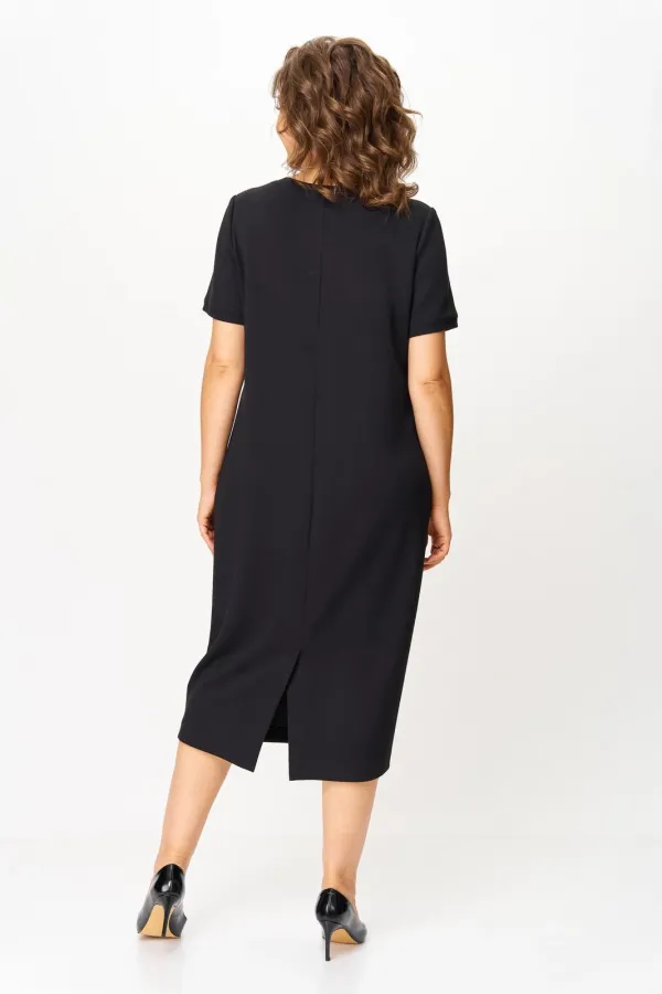 Платье выполнено из трикотажного полотна. Силуэт прямой, рукав втачной, короткий, горловина овальная. Горловина и низ рукава обработаны довязом. Спинка прямая со среднем швом. В шве внизу шлица для хода. Платье без подкладки, без застёжки.