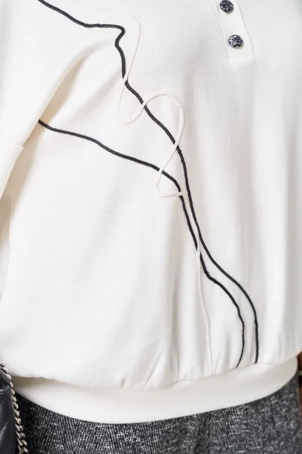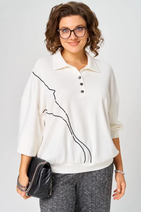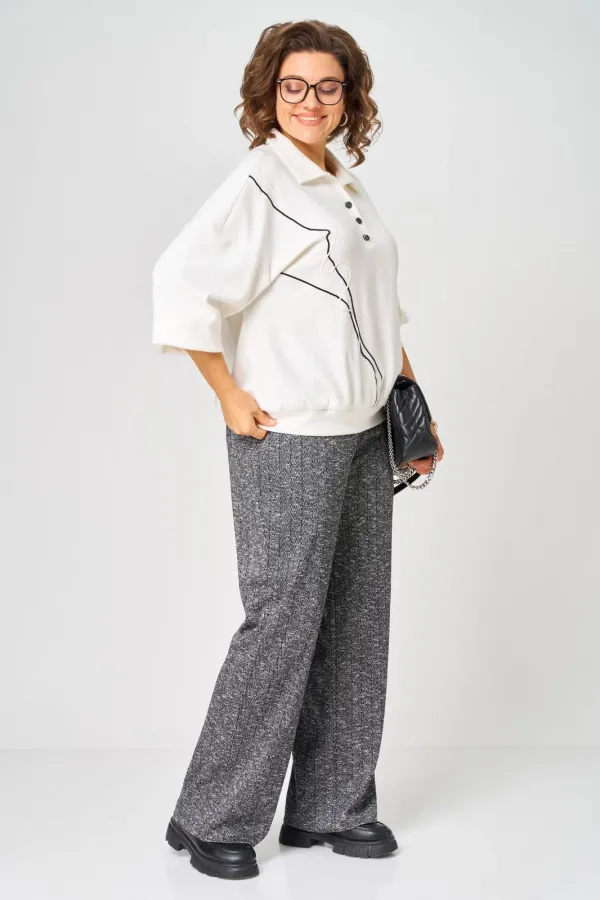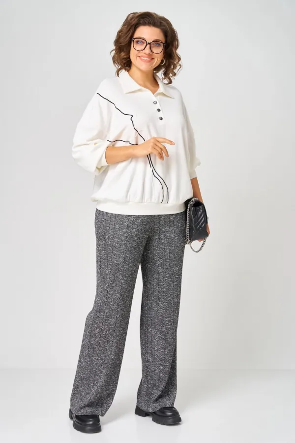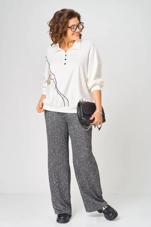 Комплект джемпер и брюки выполнени из трикотажа. Джемпер типа поло, с воротником рубашечного типа. По переду планка на пуговицах. Линия плеча спущена. По передней планке обработан декор из шнура. Брюки прямые на резинке.... Читать далее...