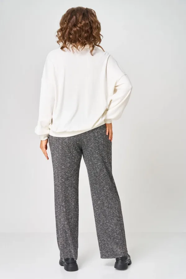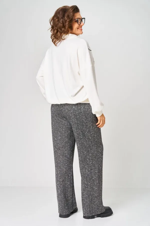 Комплект джемпер и брюки выполнени из трикотажа. Джемпер типа поло, с воротником рубашечного типа. По переду планка на пуговицах. Линия плеча спущена. По передней планке обработан декор из шнура. Брюки прямые на резинке.