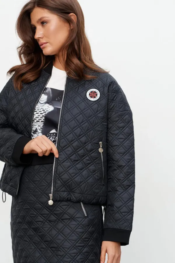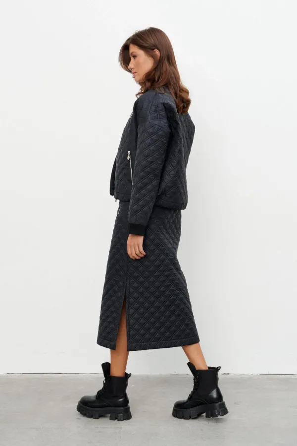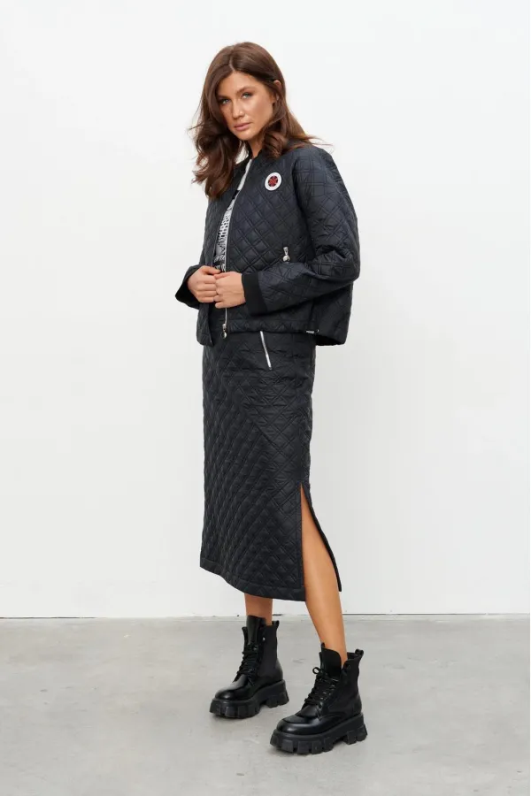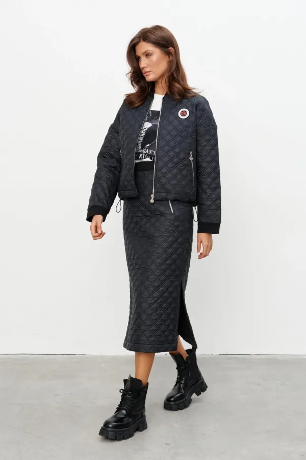 Комплект из стёганной плащёвки состоящий из бомбера и юбки миди. Бомбер с трикотажной стойкой по горловине и манжетами. По низу на кулисе со шнуром и фиксаторами. Спереди два кармана и застёжка на металлическую молнию. На груди слева настрочен декоративный шеврон.