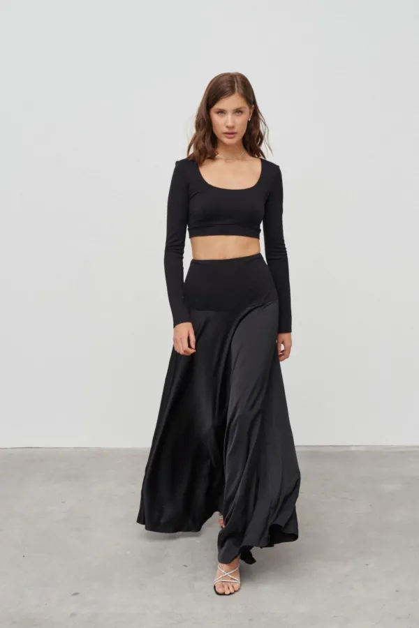 Комплект состоящий из топа и юбки-макси. Топ из трикотажного полотна прилегающего силуэта с длинным рукавом и вырезом каре спереди и сзади. Юбка из атласной ткани с кокеткой из трикотажного полотна. Застёжка на потайную молнию сбоку.