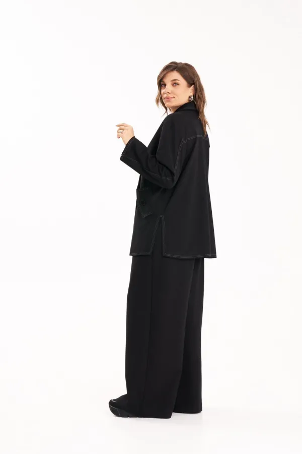 Костюм состоящий из жакета и брюк. Жакет прямого силуэта со спущенной линией плеча и двубортной застёжкой. Все края жакета с сырыми срезами, которые отстрочены контрастной ниткой. Спереди два кармана с клапанами. Брюки прямые от бедра на резинке по талии с карманами по бокам.