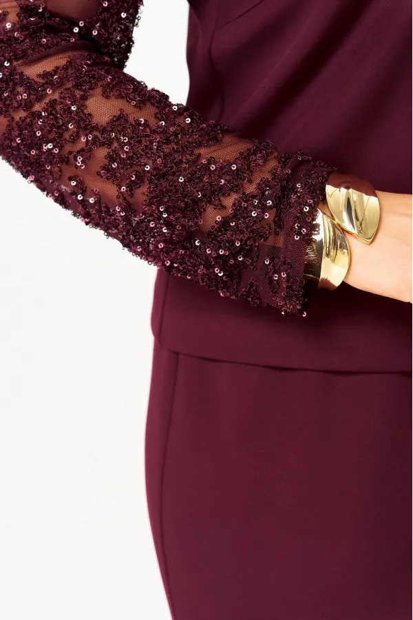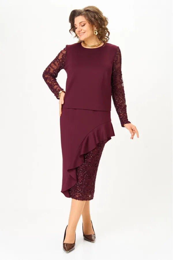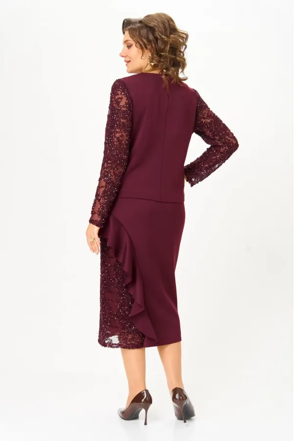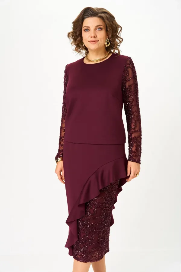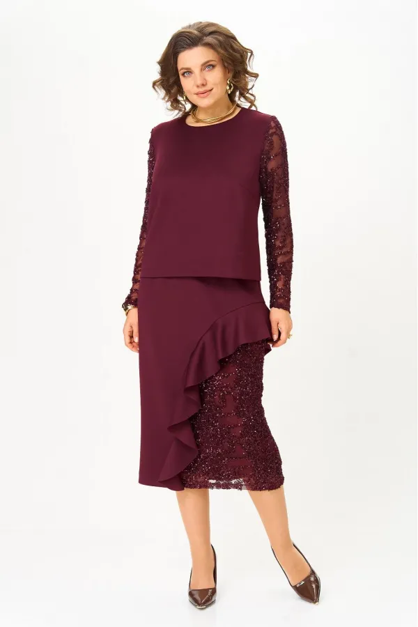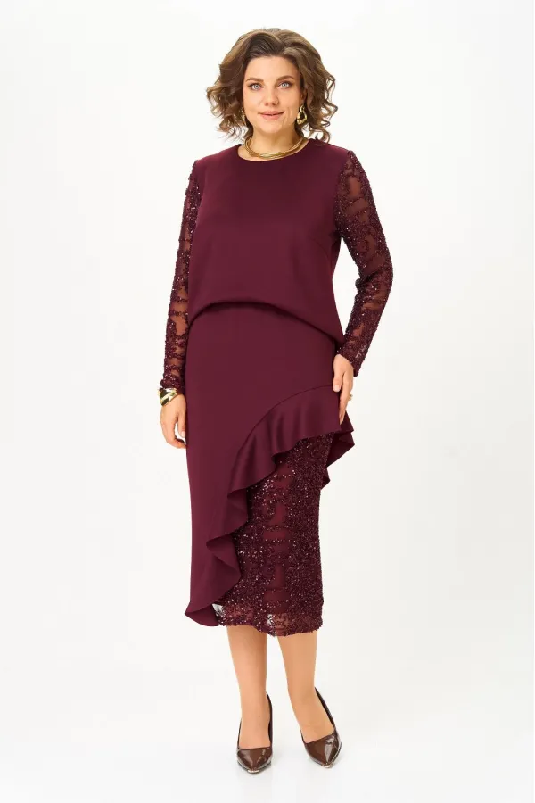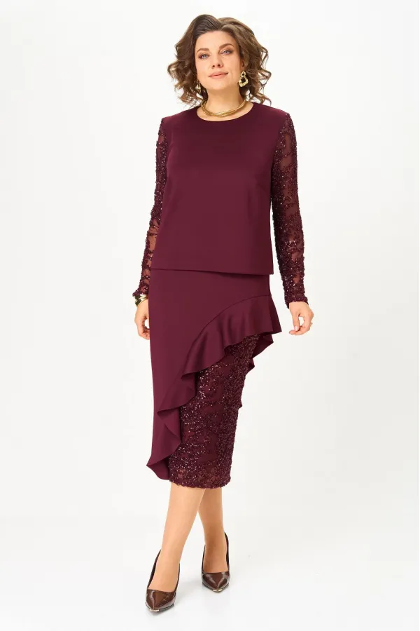 Нарядный женский комплект. Состоящий из блузона и юбки. Комплект выполнен из трикотажного полотна с добавлением хлопка. Блузон укороченный, свободного облегания, вырез горловины круглый, с застежкой на навесную петлю с пуговицей по спинке, рукав из трикотажной сетки с паетками. Юбка удлиненная, прямая, на подкладке, сбоку по низу переда и спинки фигурная вставка из трикотажной сетки с паетками и воланом.