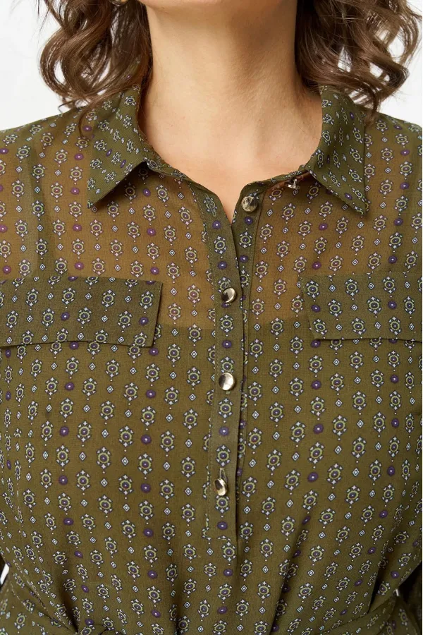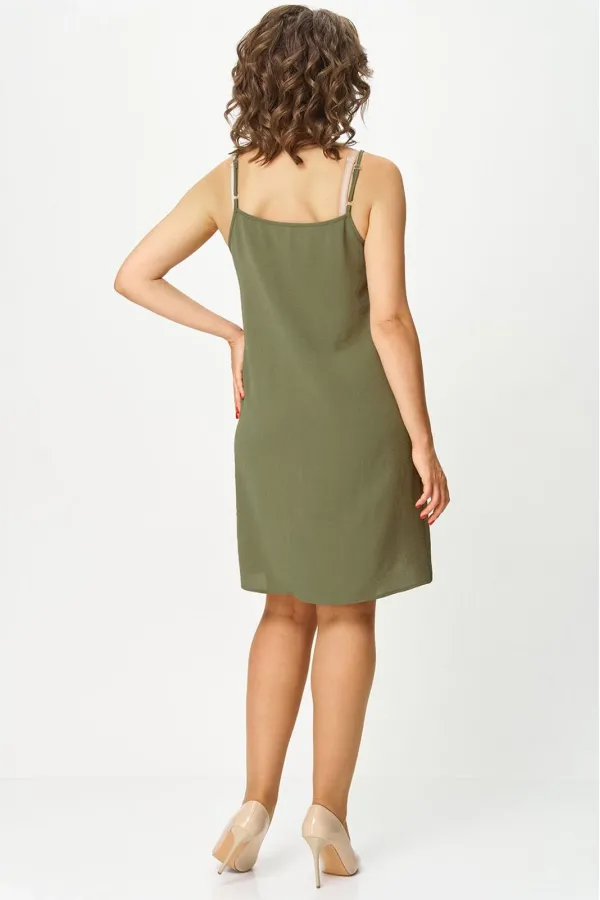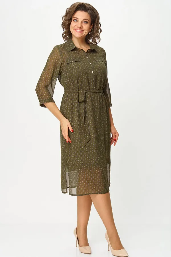 Женский комплект 2-х предметный, состоит из туники и платья. Платье прямого силуэта, с круглым вырезом горловины, обработанного стояче-отложным воротником с отрезной стойкой. Перед с нагрудными вытачками, застежкой-планкой на петли и пуговицы. Рукава втачные, одношовные, длиной 3/4. Туника прямого силуэта, на бретелях. Перед с нагрудными вытачками. Платье комплектуется съемным поясом.