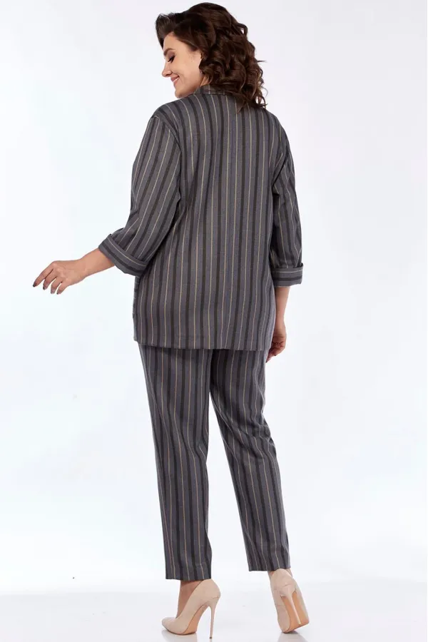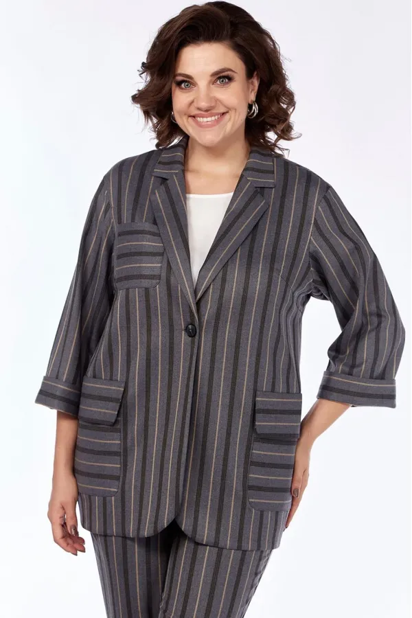 Костюм женский стильный офисный деловой брючный. Костюм брючный трех предметный. Состоит из жакета, блузы (полиэстер 100%) с коротким рукавом и брюк. Жакет прямого силуэта, без подкладки, удлиненный. Воротник пиджачного типа. Центральная застежка на петлю и пуговицу в размерах 48-52 и на две пуговицы 54-58. Детали переда с нагрудными вытачками, с большими накладными карманами с закругленными концами и клапанами, переходящими на спинку. На правой детали переда нагрудный накладной карман. Спинка со средним швом. Рукава втачные одношовные длиной 3/4. Низ рукавов с отложными манжетами. Карманы, клапаны, манжеты из отделочного материала. Блуза прямого силуэта, с круглым вырезом горловины, короткими цельнокроенными рукавами. Длина блузы по спинке 62-65 см. Брюки заужены к низу. Верхний срез брюк обработан притачным поясом, застегивающимся на петлю и пуговицу, по спинке на широкой эластичной тесьме. Центральная застежка на тесьму-молнию. Наклонные карманы в боковых швах. Задняя часть брюк с талиевыми вытачками, имитацией карманов с листочкой. С разрезами по низу.