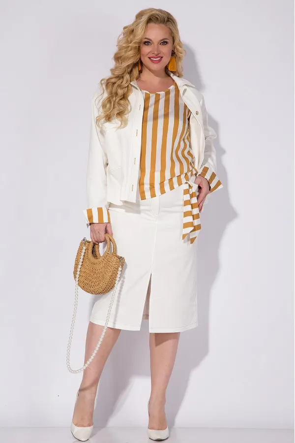 Стильный джинсовый юбочный костюм 3-ка, состоящий из жакета силуэта оверсайз, юбки и топа. Юбка и жакет выполнены из хлопкового «Джинса» светло молочного оттенка. Жакет со спущенной линией плеча, длинным рукавом на притачной манжете. Воротник в модели отложной, с центральной застежкой на петли и пуговицы. Жакет с кулисой на утяжку с регуляторами по бокам (при желании), для приталивания изделия. Спинка с отрезной кокеткой и декоративным шевроном- нашивкой. Юбка прямого покроя, с застежкой на молнию и обработанным гульфиком. Спереди расположены карманы и разрез для свободы движения. Пояс притачной с резинкой на боковых участках пояса. Декоративный элемент в виде платка из отделочной ткани на съёмном карабине. В комплект входит топ из ткани в полоску в яркой расцветке шафран. Топ с округлым вырезом горловины без рукавов. Изюминкой данной модели служат съемные манжеты из отделочной ткани с застежкой на пуговки! Стильный, оригинальный костюм и в пир и в мир! Все элементы данного костюма можно комбинировать с изделиями из Вашего гардероба!
