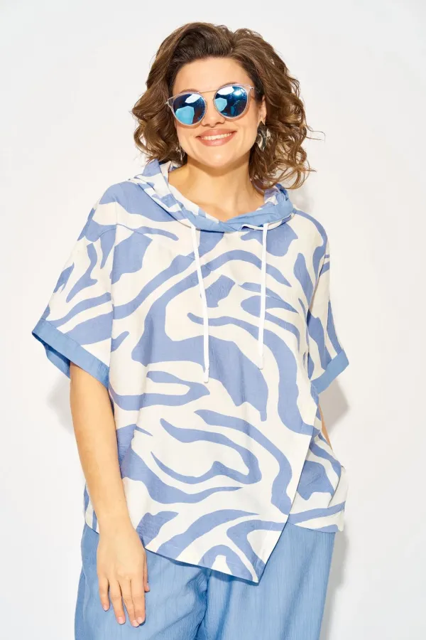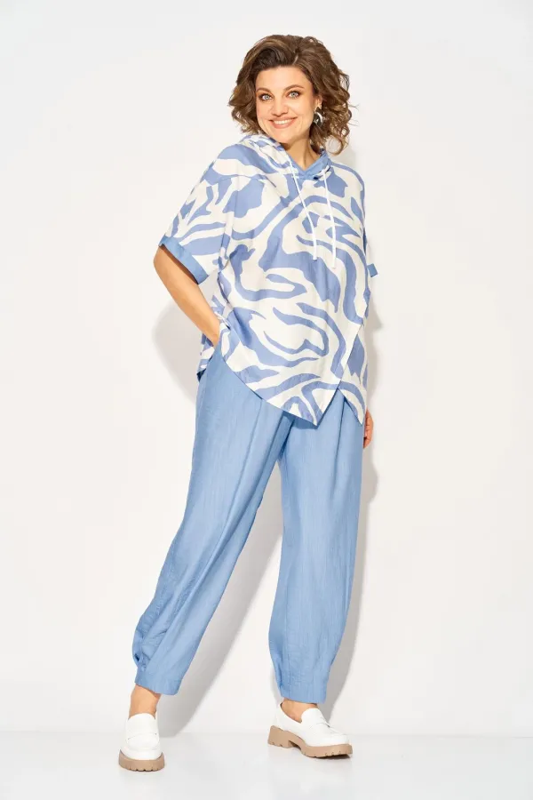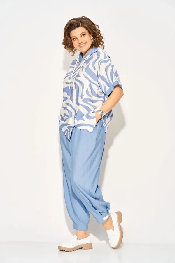 Стильный летний костюм, состоящий из удлиненной туники свободного покроя и брюк. Оригинальная туника из вискозы добавлением льна. Модель с цельнокроеным укороченным рукавом и ассиметричным подрезом по полочке. Модель с легким капюшоном и кулисой на шнуровке. Низ изделия разноуровневый. Спинка цельная. В комплекте свободные брючки, завышенной посадки. Брюки на притачном поясе с круговой резинкой. Имеются боковые карманы. Низ с заложенными складками, что придает изделию более спортивный образ. Длина туники по спинке - 68 см, рукав – около 30 см.