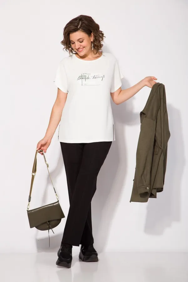 Модель свободного силуэта с отложным воротником на стойке. Застежка центральная на петли и пуговицы. Рукав на рубашечной пройме, длинный, низ оформлен манжетам. Полочка с ассиметричным накладным карманом с декором в виде молнии. Спинка на кокетке с заложенными складками на свободу движения. По бокам имеются карманы. В комплекте топ на спущенном цельнокроеном рукаве с округлым вырезом горловины. Лиф украшает печать накат в тон изделия.
