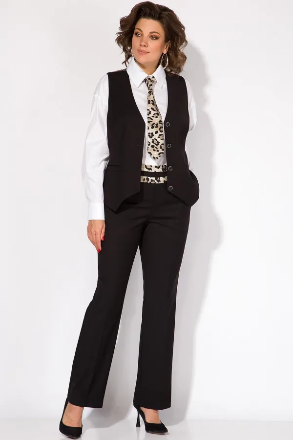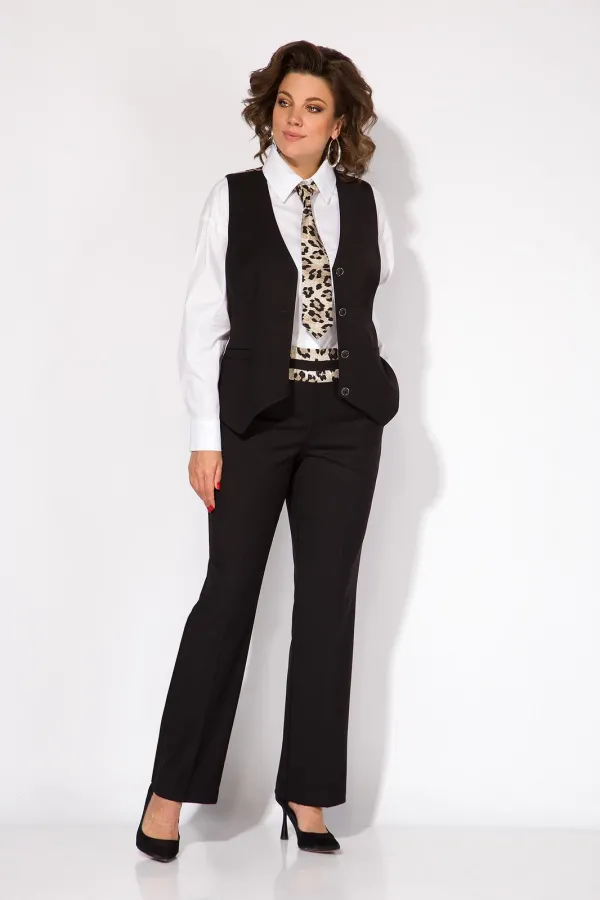 Жилетка полупрниталенного силуэта, с застежкой на пуговицы выполнена из костюмной ткани. По полочке расположены продольные рельефы с прорезными карманами. Спинка выполнена из шелкового сатина с эффектным принтом. Есть хлястик для приталивания. Жилетка на шелковой подкладке. Брюки в костюме со средней посадкой на притачном поясе-кокетке со вставками из отделочной ткани. Застежка – потайная тесьма-молния. По спинке имеется резинка. Брюки слегка заужены в области колена. Строгость и утонченность - основные характеристики женской костюмной двойки.