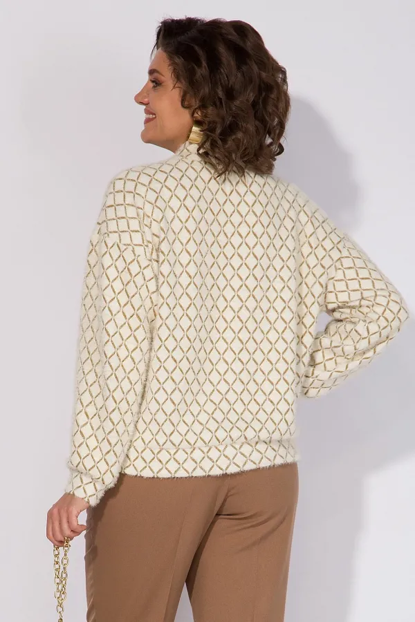 Мягкий и уютный джемпер в стиле «O L D M O N E Y» выполнен из трикотажа с эффектом ангоры тс рисунком. Эффектная V-образна горловина, переходящая в мягкую стойку. Плечевой пояс спущенный, с рукавом полной длины. Низ изделия и низ рукава оформлен притачными манжетами из основной ткани. Спинка без особенностей. В комплекте классические женские брюки, со средней посадкой, прямого покроя от бедра. Застежка – брючная тесьма-молния с обработанным гульфиком. Карманы боковые. Пояс притачной, в боковых участках вставлена резинка на свободу. По переду заутюжены канты. Спинка с Талиевыми выточками. Подгибка брюк –– 4 см. Длина по спинке – 65 см, рукав- 62 см.