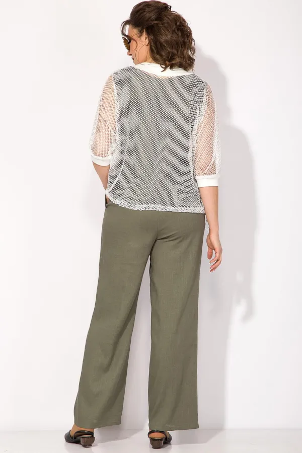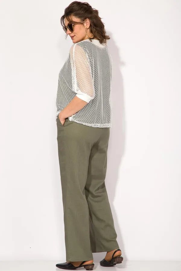 Оригинальный женский комплект 3-ка, в стиле спорт-шик. Топ полуприлегающего силуэта с V-образной горловиной и свободные широкие брюки на резинке выполнены из льна с добавлением вискозы.