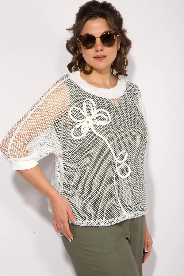 Блузон свободного силуэта, с цельнокроеным рукавом длиной ¾-ти выполнен из сетки. Вырез горловины, а также низ рукава обработан притачной манжетой из кашкорсе. Лиф декорирован вышивкой в виде цветка с бусинами. Низ изделия присбаривается на кулиску.