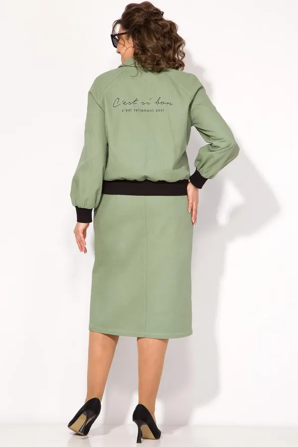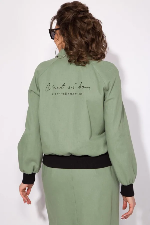 Эффектный джинсовый костюм, состоящий из жакета и юбки - представляет собой идеальное сочетание комфорта, стиля и универсальности. Жакет по типу бомбера, с рукавом покроя реглан. Воротник отложной, застежка центральная на металлическую молнию. Низ рукава и низ изделия обработаны притачными манжетами из кашкорсе. Спинка с декоративной печатью – накат.