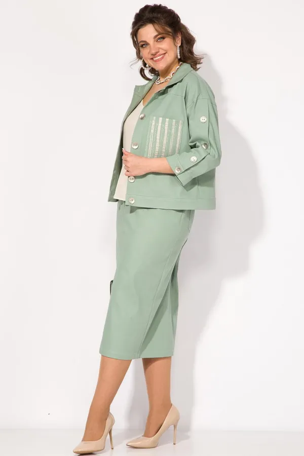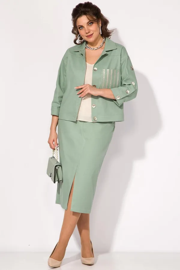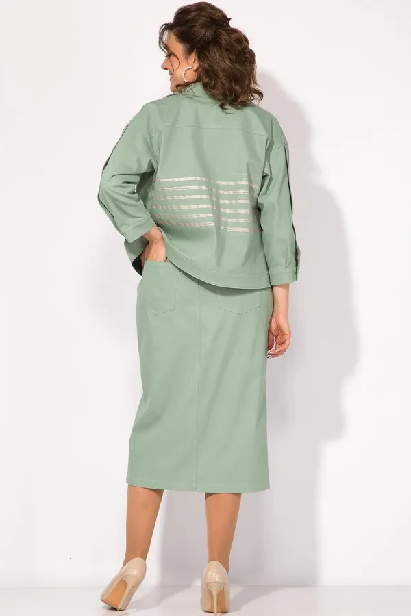 Представляем Вам стильный женский костюм из хлопкового денима (Джинс), состоящий из зауженной юбки и свободного жакета! Жакет свободного силуэта, выполнен их хлопка под Джинс. Воротник отложной; застежка центральная на петли и пуговицы. Рукав со спущенным плечевым поясом, длиной ¾-ти на притачной манжете. По центру рукава расположена декоративная застежка на петли и пуговицы. Перед с кокеткой, с ассиметричным накладным карманом. Спинка повторяет дизайн полочки. По спинке расположена ассиметричная печать в виде полоски!