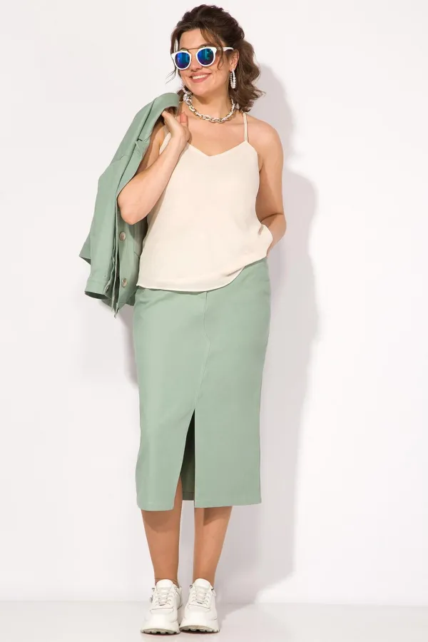 В комплекте юбка-карандаш зауженная к низу, длиной за колено. Модель с пикантным разрезом по переду. Застежка на металлическую молнию с обработанным гульфиком. Пояс притачной, в боковых участках вставлена резинка. По спинке расположены накладные карманы. Юбка без подкладки выполнена из джинсовой ткани.