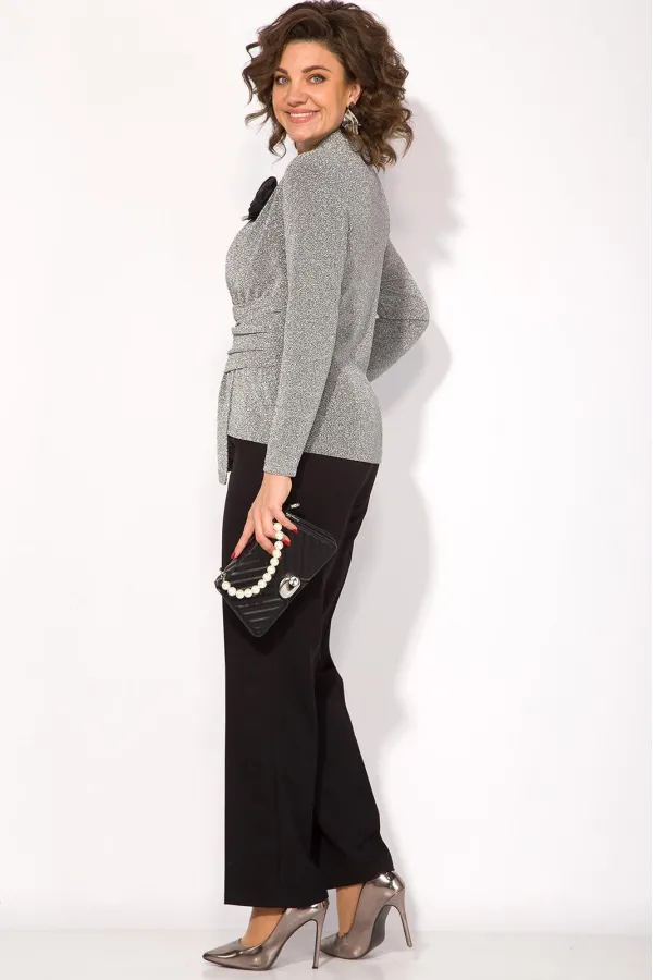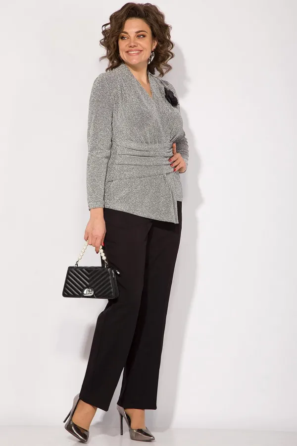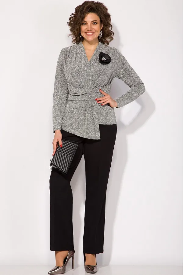Этот комплект станет отличным выбором для тех, кто хочет выглядеть стильно и ярко, не жертвуя комфортом и удобством. Эффектная нарядная блузка, выполнена из мягкого трикотажа с мерцающим эффектом. Такой дизайн ткани придает необычное переплетение нитей: с изнанки мягкий однотонный трикотаж! Вырез горловины мягкая стойка, переходящая в V-образный вырез с имитацией запаха. По полочке заложены декоративные складки для комфортного прилегания изделия. Низ блузки ассиметричный. Пояс декорирован задрапированным поясом из основной ткани, что зрительно стройнит и скрывает все недостатки фигуры. Рукав в точной, длинный. Спинка приталенная, без особенностей. К блузке предусмотрен съемная брошь, в виде цветка.