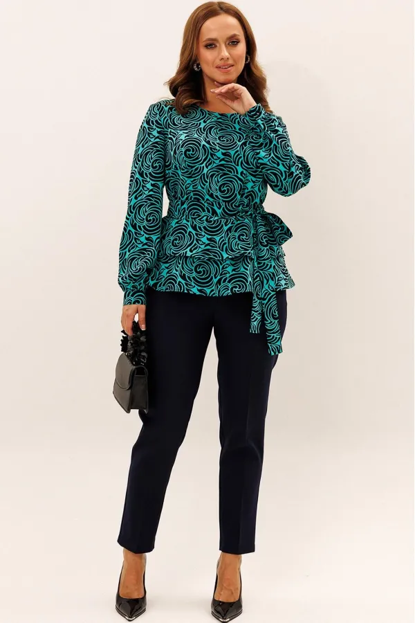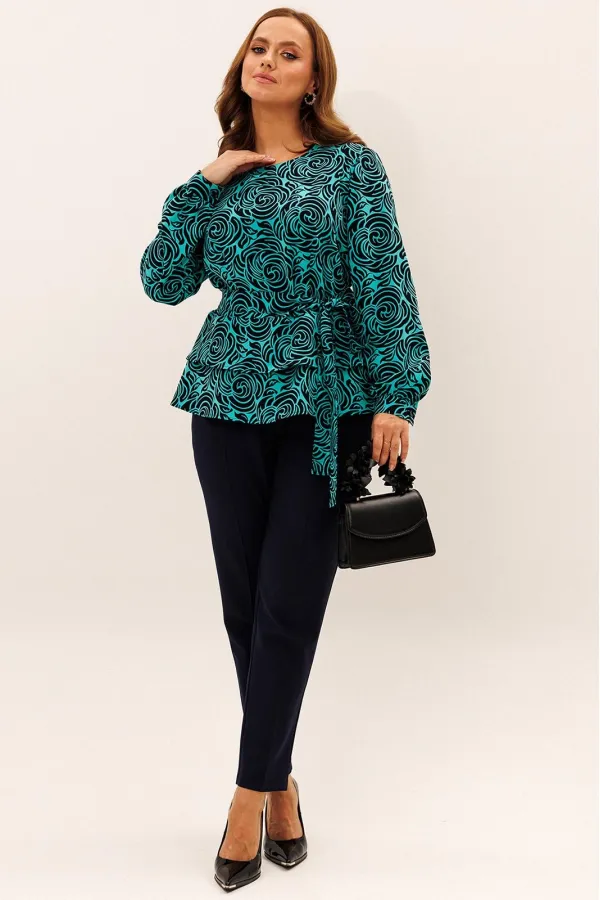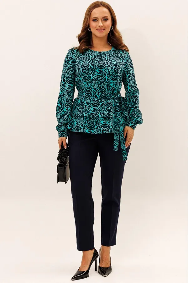пуговицу. Блуза со съёмным поясом. Брюки к низу заужены, верхний срез брюк