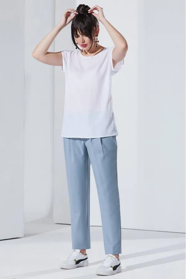 Блуза с округлым вырезом горловины и спущенной линией плеча. По горловине спинки застёжка на петлю и пуговицу.