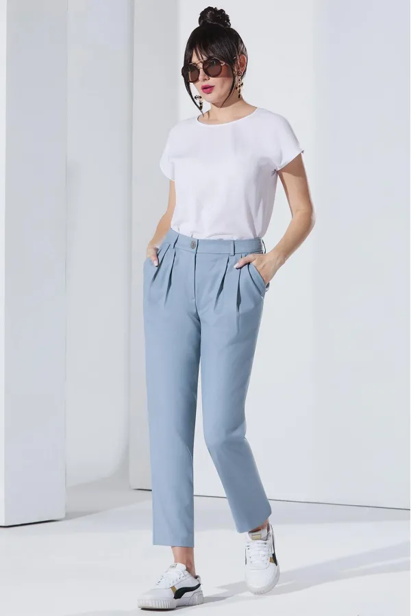 Брюки на притачном поясе. Передние половинки с наклонными карманами к боковым швам и складками от пояса.