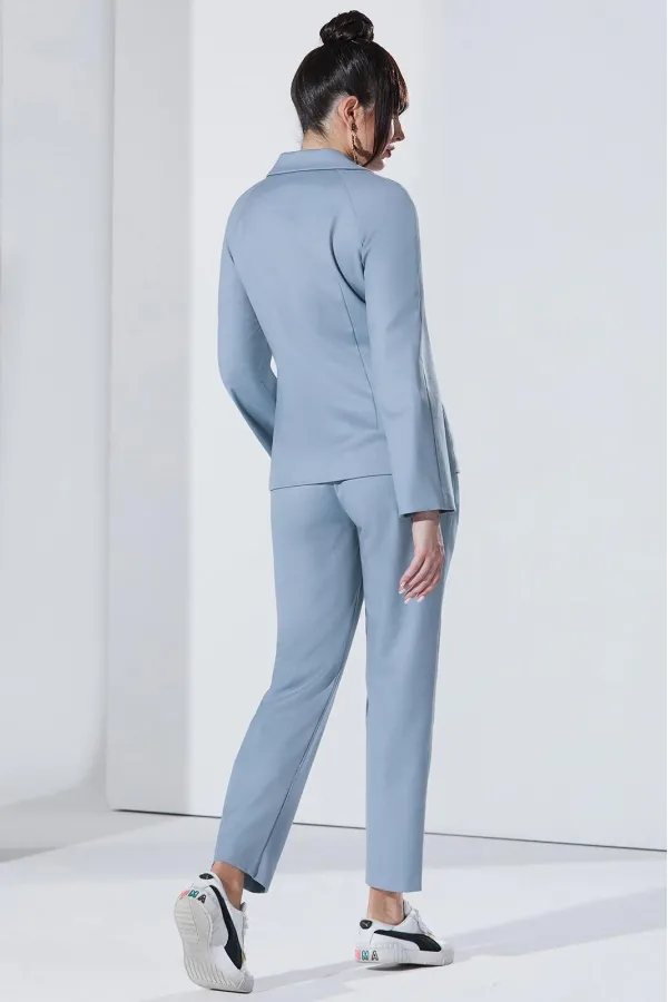 Жакет со стояче - отложным воротником пиджачного типа и двубортной застёжкой на петли и пуговицы. Перед с двумя рельефами и карманами в них. Спинка с талиевыми вытачками. Рукава - реглан. Жакет на подкладке и съёмным поясом из ткани по талии.