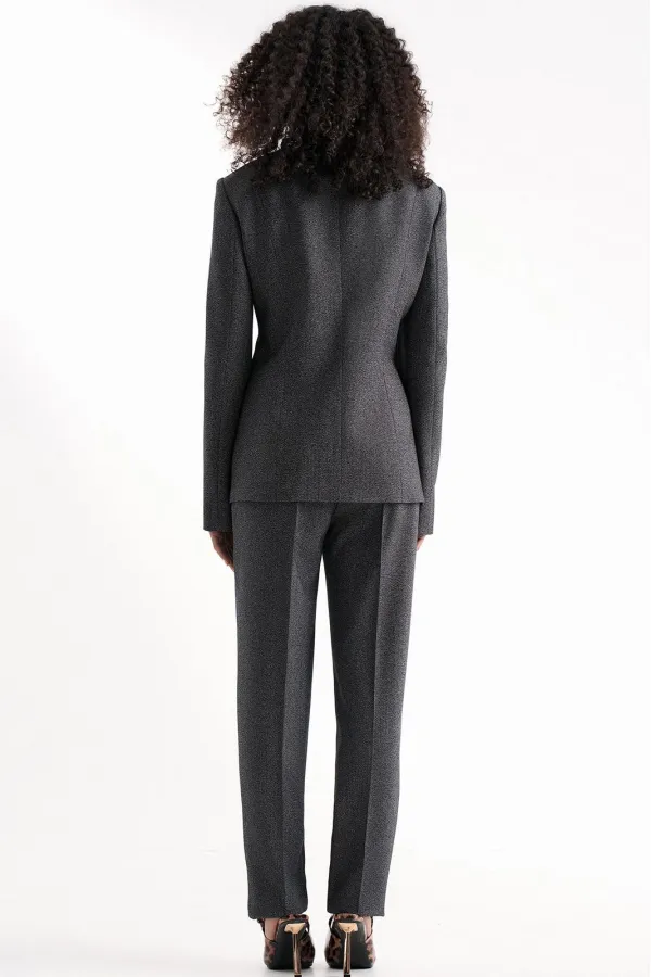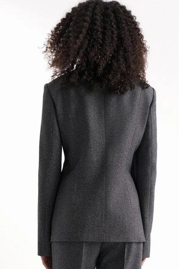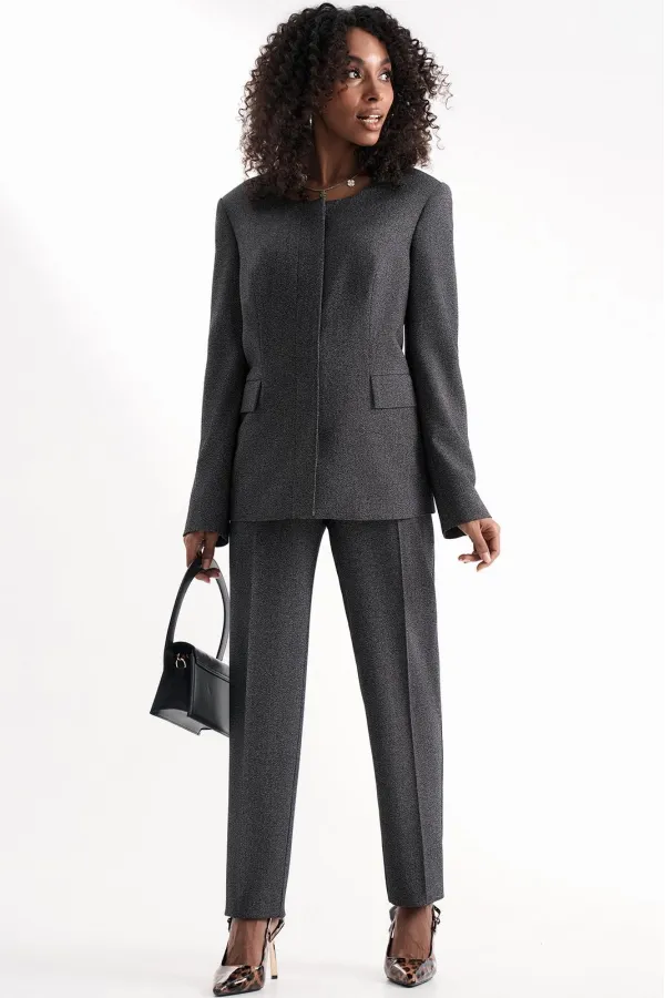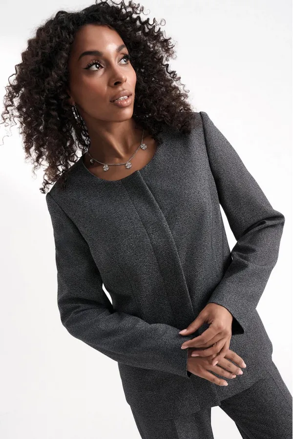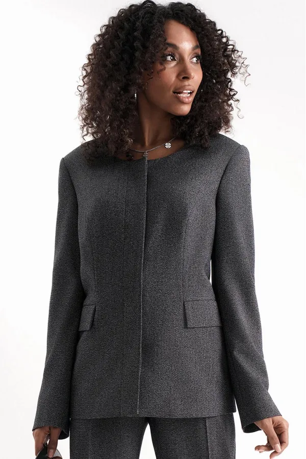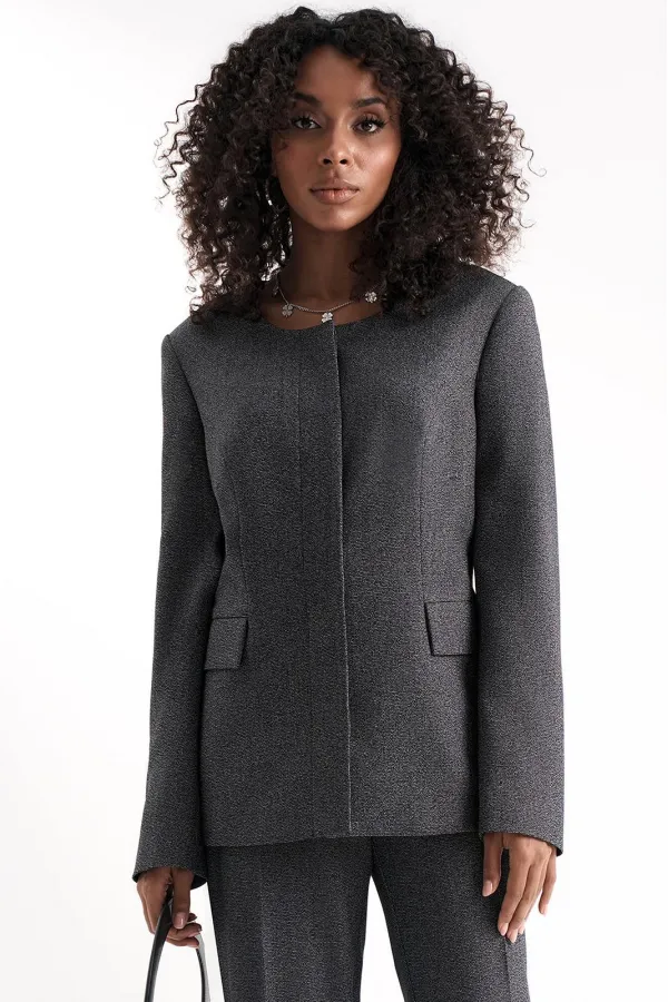 Жакет с округлым вырезом горловины и центральной застёжкой на потайные пуговицы. Перед с карманами с клапанами в нижней части. Спинка со средним швом и двумя рельефами. Рукава втачные. Жакет на подкладке.