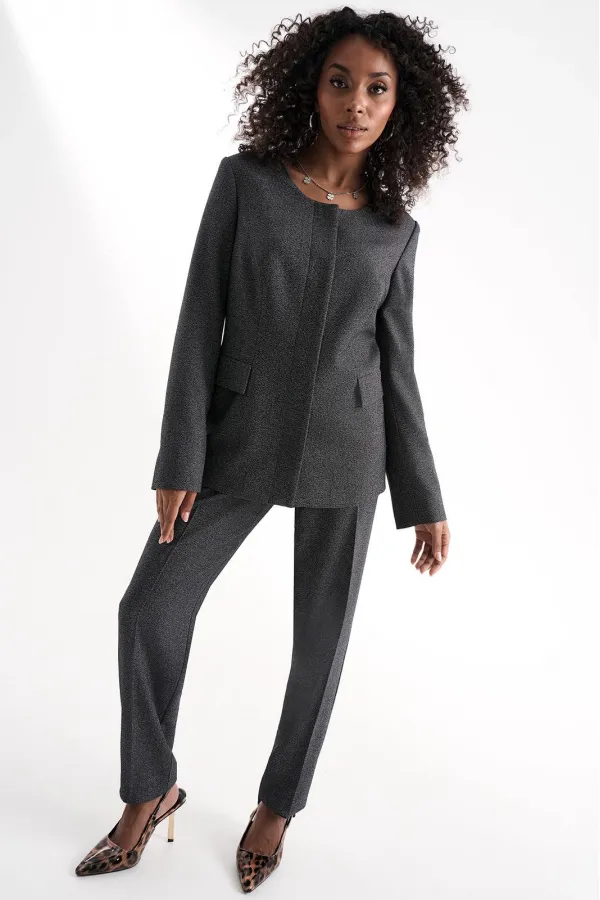 Костюм брючный.Жакет с округлым вырезом горловины и центральной застёжкой на потайные пуговицы. Перед с карманами с клапанами в нижней части. Спинка со средним швом и двумя рельефами. Рукава втачные. Жакет на подкладке.Б... Читать далее...
