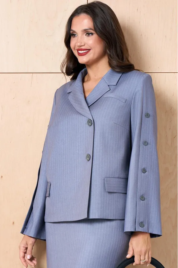 Жакет со стояче-отложным воротником пиджачного типа и смещённой застёжкой на петли и пуговицы. Перед с карманами с клапанами в нижней части. Спинка со средним швом и талиевыми вытачками. Рукава втачные с пуговицами (три нижних из которых расстегиваются). Жакет на подкладке.