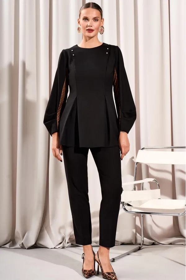 Костюм брючный.Свитшот с округлым вырезом горловины и складками от рельефов по переду и спинке. Перед со стразами в верхней части. Спинка с потайной молнией в среднем шве. Рукава втачные со складками по окату и со складк... Читать далее...