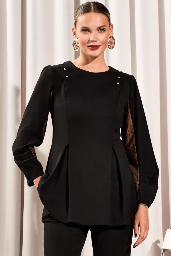 Свитшот с округлым вырезом горловины и складками от рельефов по переду и спинке. Перед со стразами в верхней части. Спинка с потайной молнией в среднем шве. Рукава втачные со складками по окату и со складками нижней части рукава, и с деталью из декоративной сетки и подложки.
