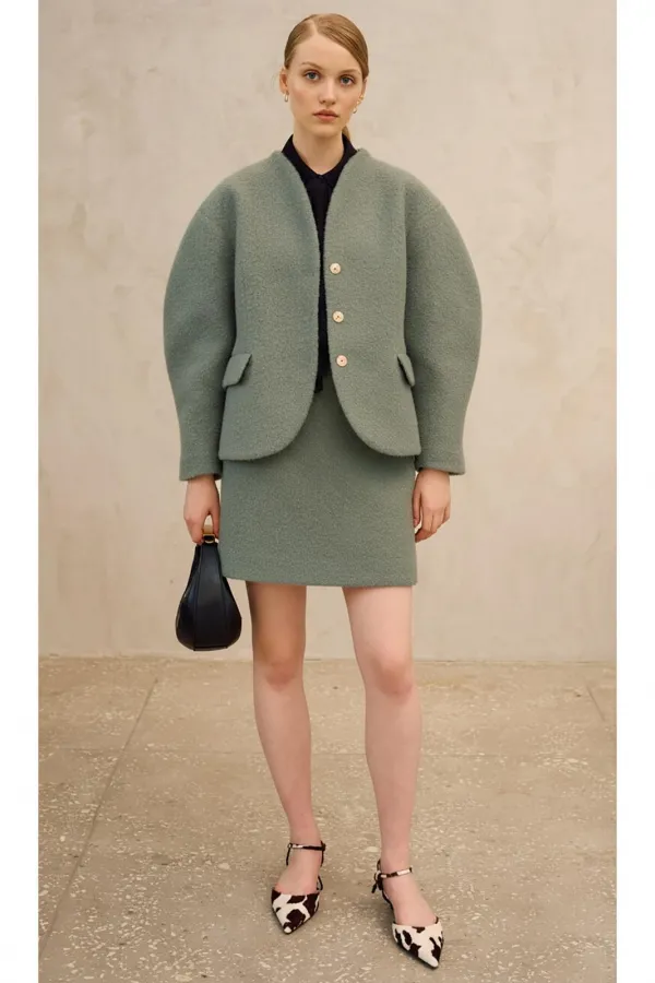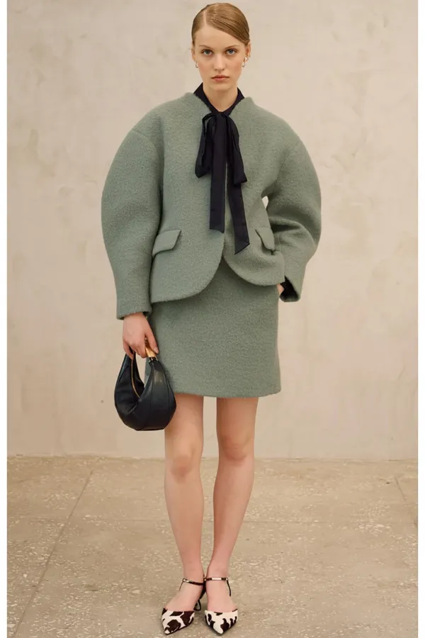 Комплект состоит из полупальто и юбки. Полупальто полуприлегающего силуэта на подкладке. Линия плеча спущена, рукав фигурной формы. Цельнокроеный воротник, переходящий в центральную застежку на потайные кнопки. По переду прорезные карманы с отлетными клапанами. По спинке средний шов и рельефы. Юбка в длине мини, прямого силуэта, на обтачке. По бокам прорезные карманы. По спинке средний шов, переходящий в потайную молнию.