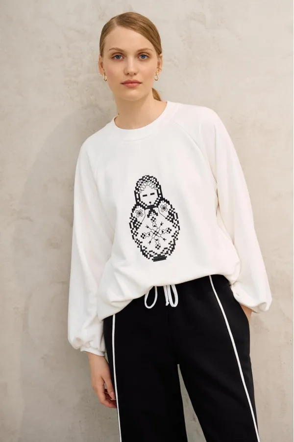 Спортивный костюм выполнен из трикотажного полотна. Худи свободного кроя. Линия плеча спущена, рукав длинный, по низу рукава сборка с притачной планкой. Округлый вырез горловины, планка. По центру худи вышивка, имитирующ... Читать далее...