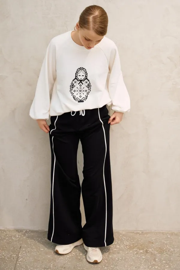 Спортивный костюм выполнен из трикотажного полотна. Худи свободного кроя. Линия плеча спущена, рукав длинный, по низу рукава сборка с притачной планкой. Округлый вырез горловины, планка. По центру худи вышивка, имитирующая ручной стежок. Брюки прямого силуэта, свободного кроя, по поясу резинка и втянут шнур. В боковых швах прорезные карманы. По переду брюк вертикальные подрезы с отделочным кантом.