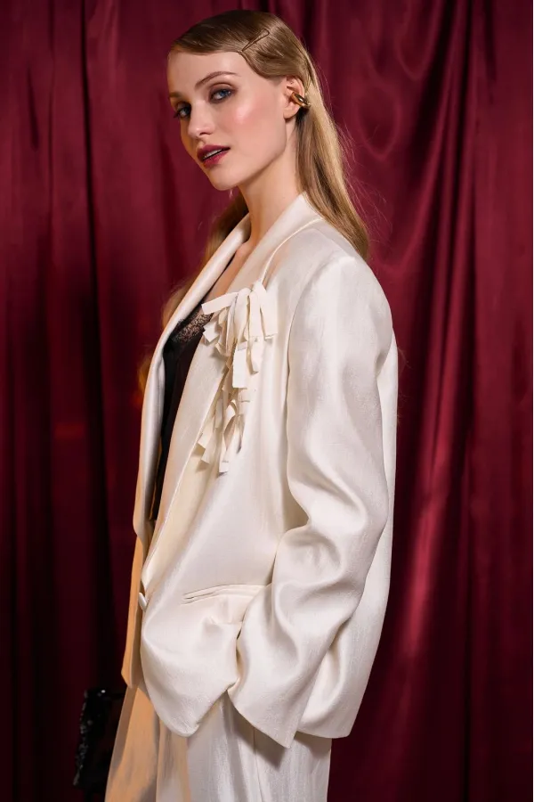 Костюм тройка, состоит из жакета, брюк и топа. Жакет свободного кроя, прямого силуэта на подкладке. Рукав длинный втачной, по локтевому шву шлица. Воротник шалька, центральная застежка на петли и пуговицы. По бокам прорезные карманы с клапаном. По спинке средний шов, переходящий в отлетную шлицу. Топ прямого силуэта, выполнен из блузочной ткани. По переду надстрочное кружево. Топ на регулируемых бретелях.