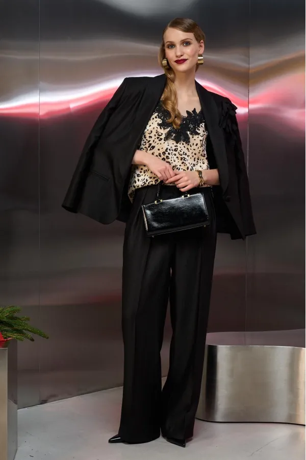 Костюм тройка, состоит из жакета, брюк и топа. Жакет свободного кроя, прямого силуэта на подкладке. Рукав длинный втачной, по локтевому шву шлица. Воротник шалька, центральная застежка на петли и пуговицы. По бокам прорезные карманы с клапаном. По спинке средний шов, переходящий в отлетную шлицу. Топ прямого силуэта, выполнен из блузочной ткани. По переду надстрочное кружево. Топ на регулируемых бретелях.
