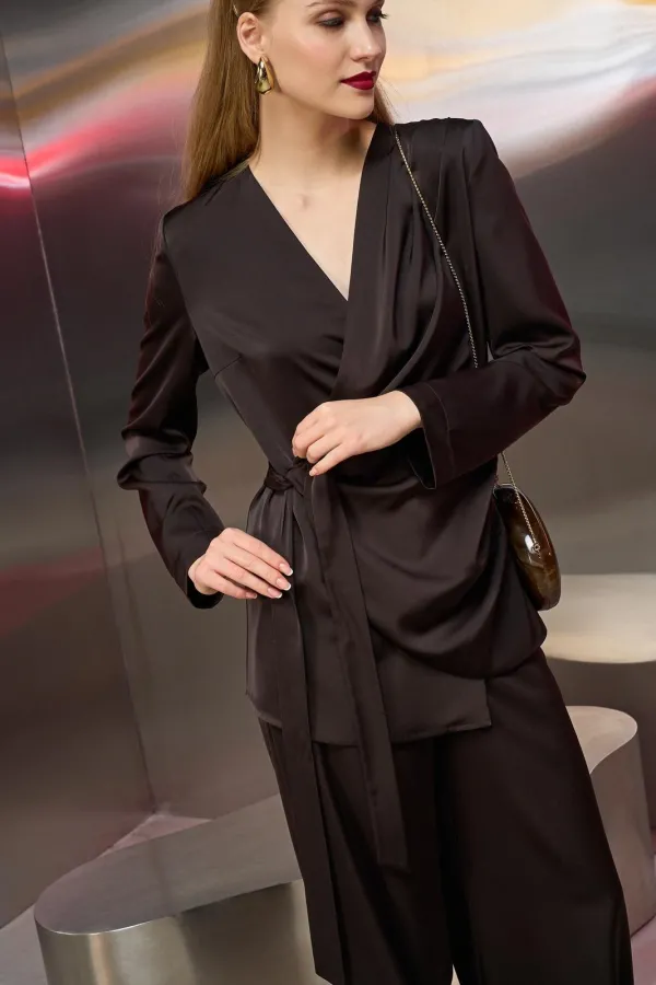 Костюм состоит из блузы и брюк. Блуза полуприлегающего силуэта, ассиметричная с драпировкой, на запах и завязкой сбоку. Рукав длинный втачной. На спинке средний шов и вытачки. Брюки на притачном поясе с резинкой по спинке, застёжка на молнию и петлю-пуговицу. В боковых швах прорезные карманы.