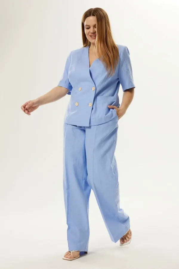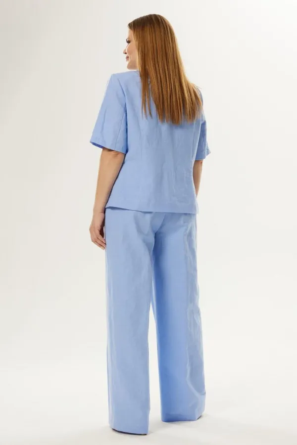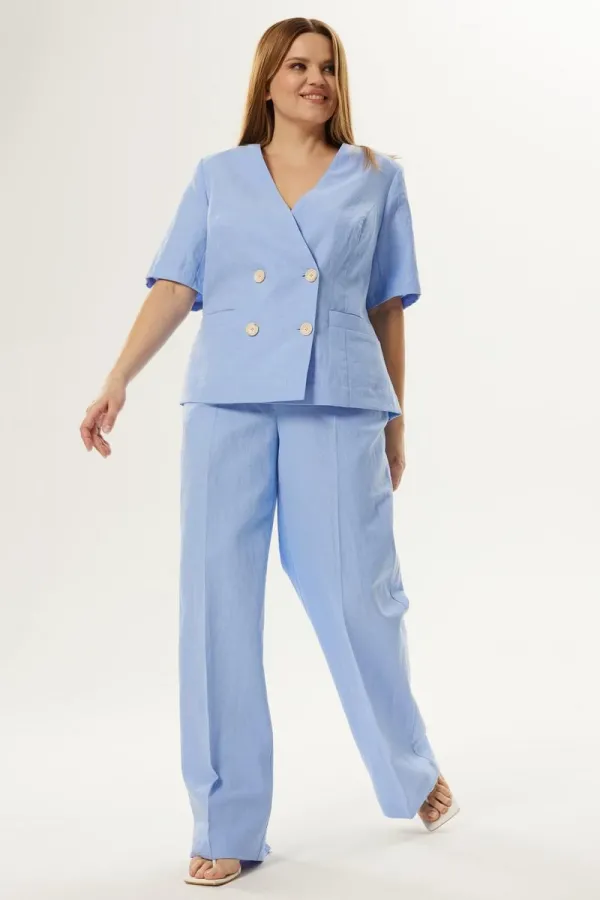 Костюм женский льняной, состоящий из жакета и брюк. Жакет двубортный укороченный, полуприлегающего силуэта. Застежка центральная на петли и пуговицы. Перед с прорезными функциональными карманами с листочкой. Рукав втачно... Читать далее...
