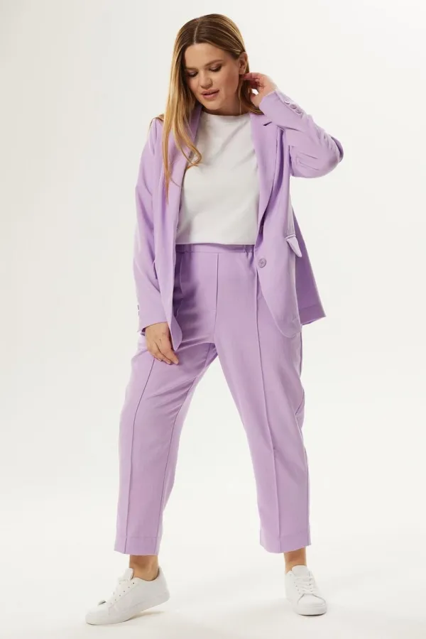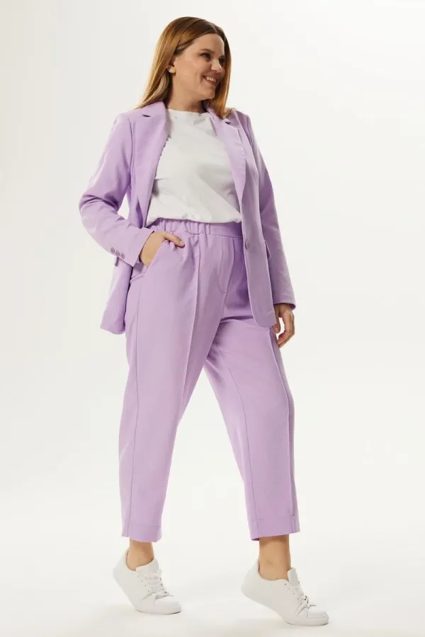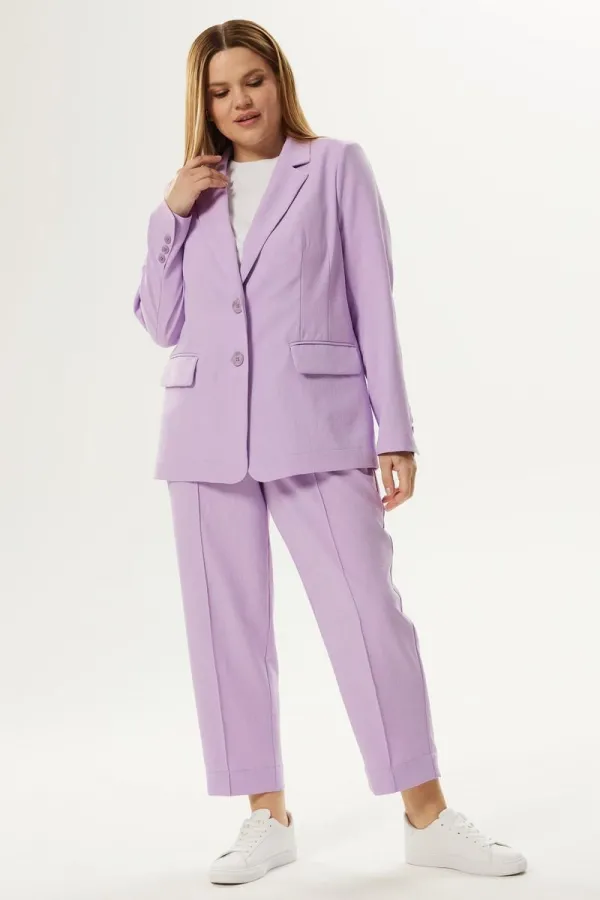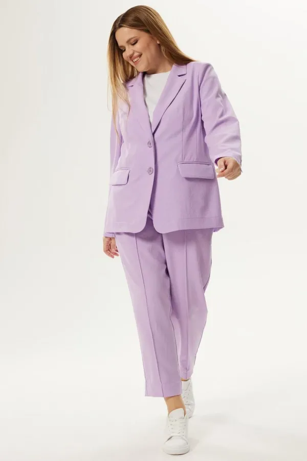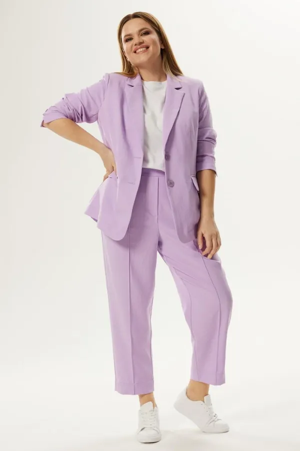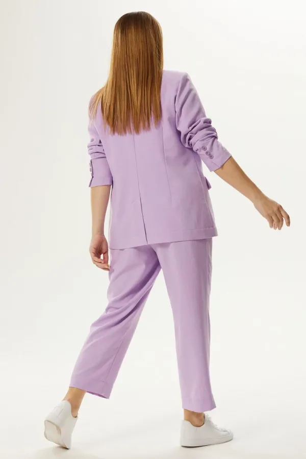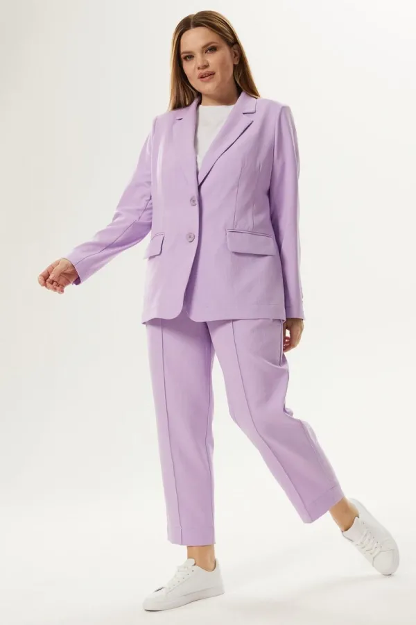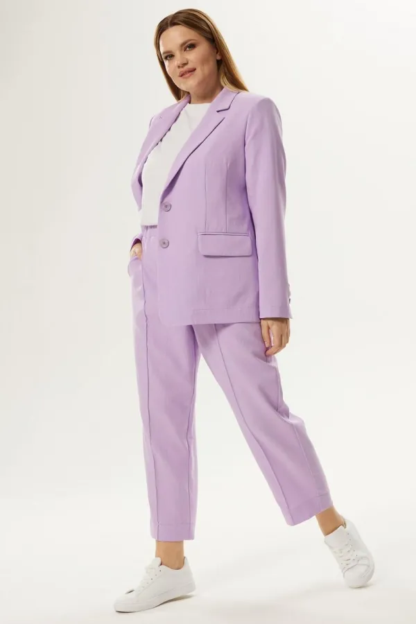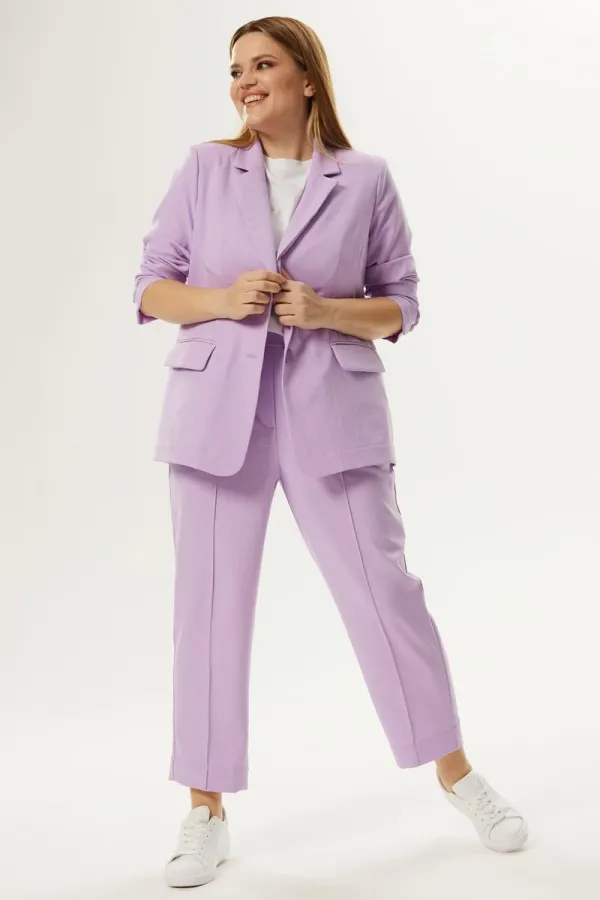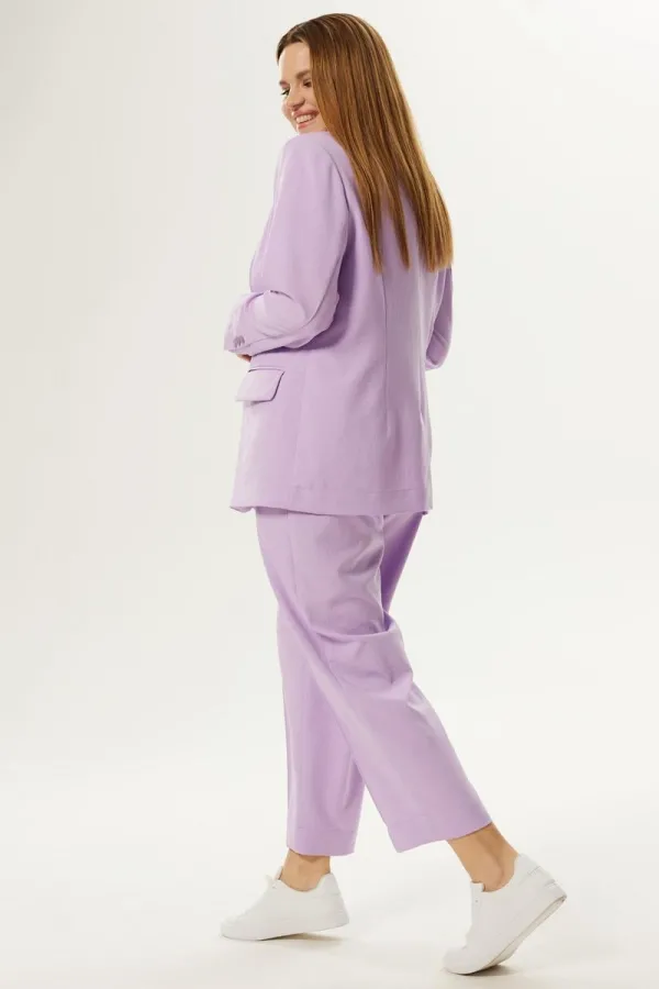 Костюм женский, состоящий из жакета и брюк. Жакет полуприлегающего силуэта, однобортный, застежка на две петли и пуговицы. Воротник пиджачного типа. На полочке расположены прорезные карманы. Спинка с центральным швом и ш... Читать далее...